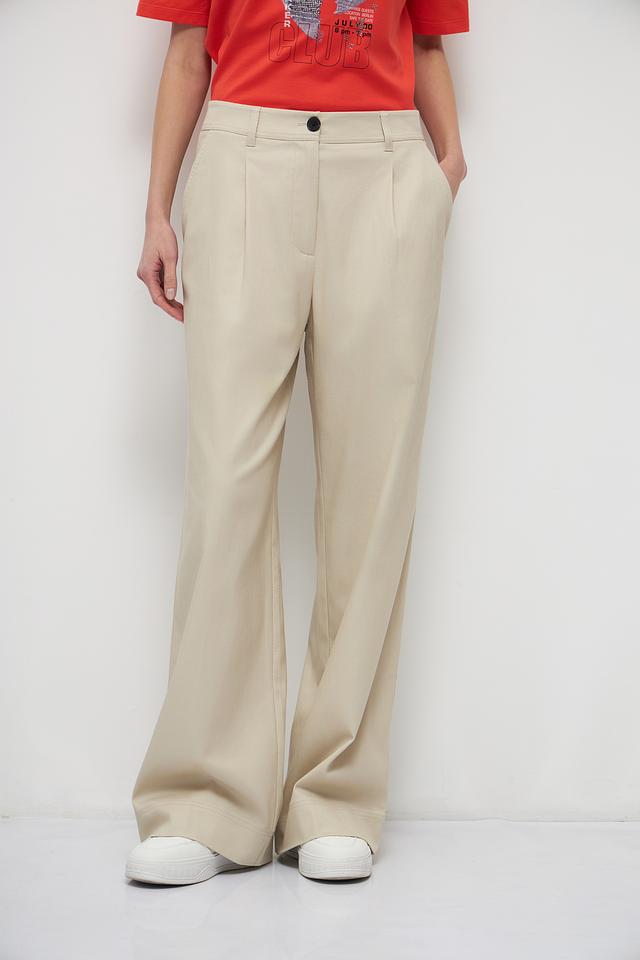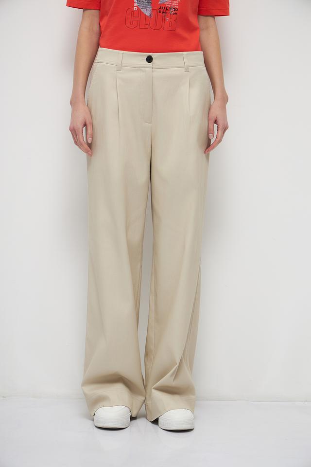 Брюки имеют прямой крой и высокую посадку, что обеспечивает комфортную посадку по фигуре и свободу движений. Модель дополнена аккуратными складками спереди, которые придают ей элегантный вид.