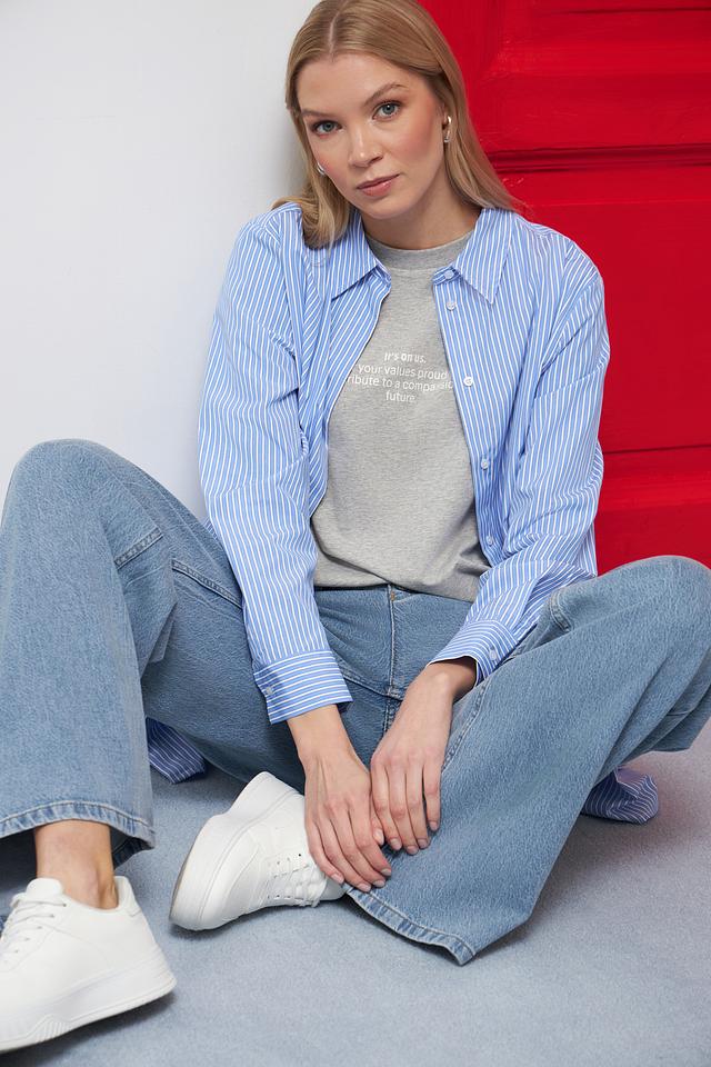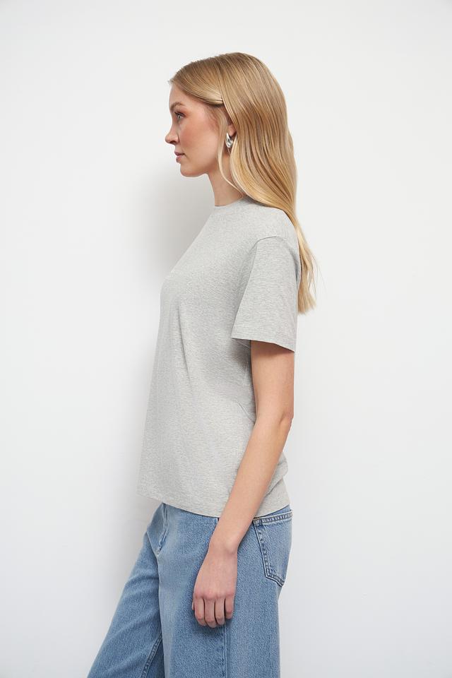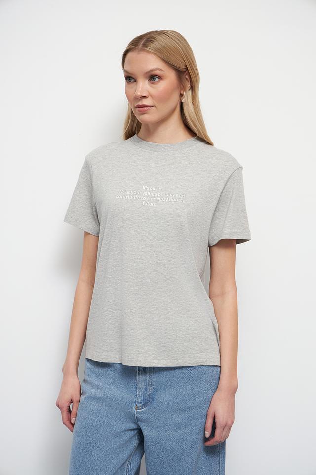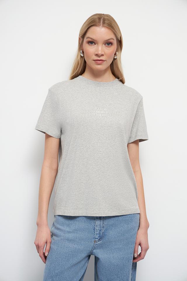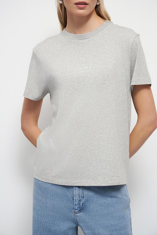 Модель имеет прямой, слегка свободный крой, который не сковывает движений. Футболка выполнена в светло-сером цвете, который легко сочетается с другими элементами гардероба.