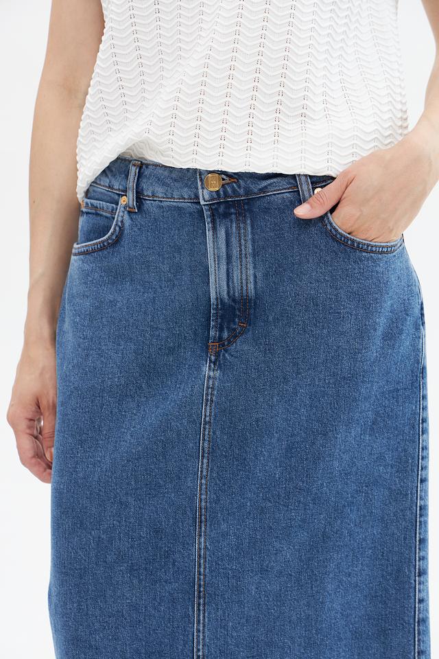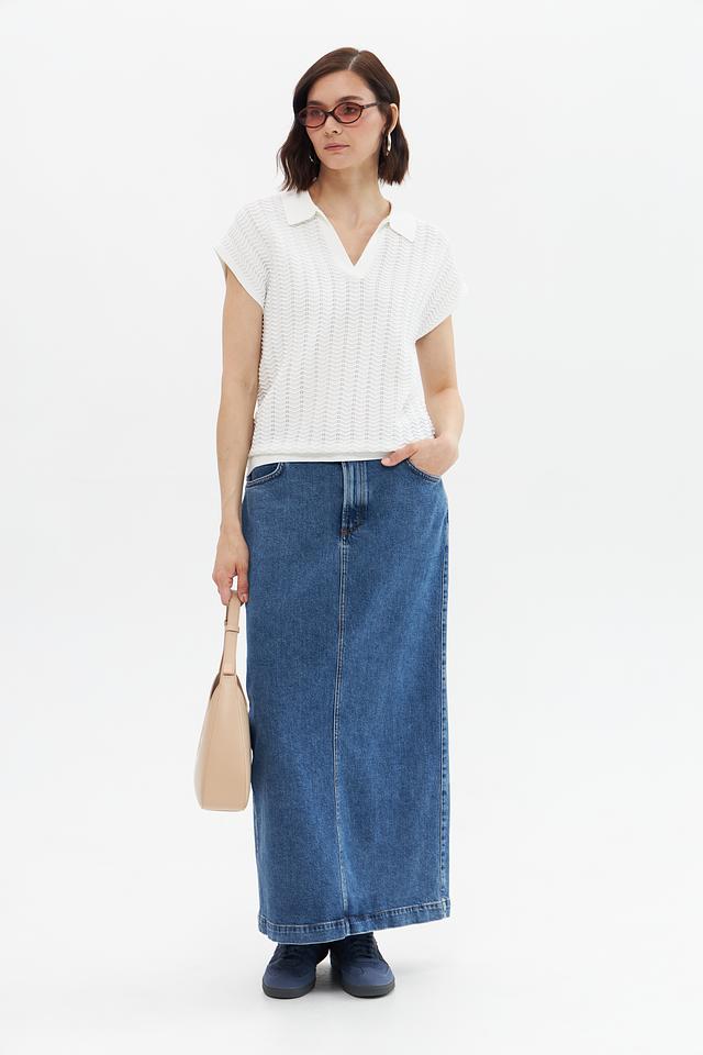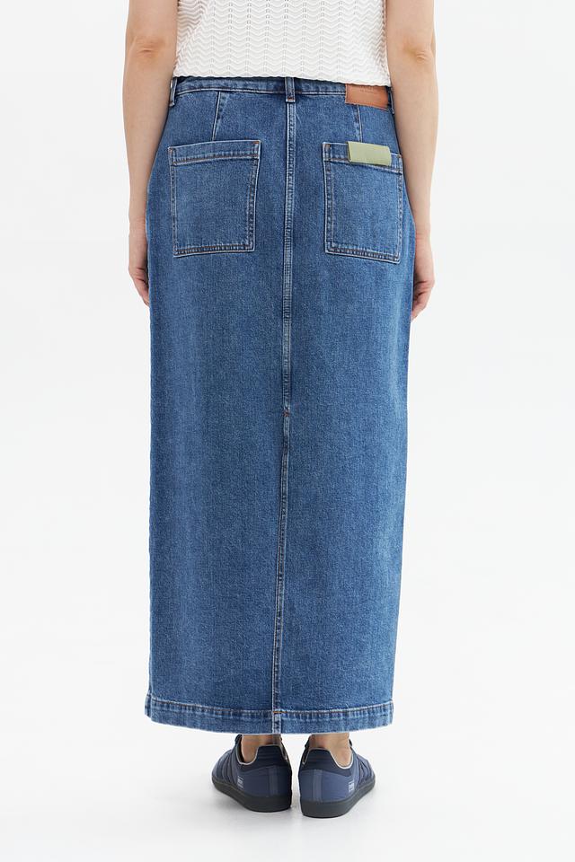 Юбка имеет прямой крой и длину макси, что делает ее универсальной и подходящей для различных типов фигуры. Классический синий цвет и традиционная джинсовая фактура позволяют легко сочетать эту юбку с различными элементами гардероба – от простых футболок до элегантных блузок.
