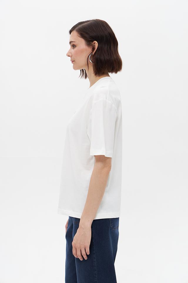 Футболка имеет прямой крой, который подходит для любого типа фигуры. На груди расположен небольшой логотип бренда, выполненный в тон изделия, что придает ей элегантный и минималистичный вид.