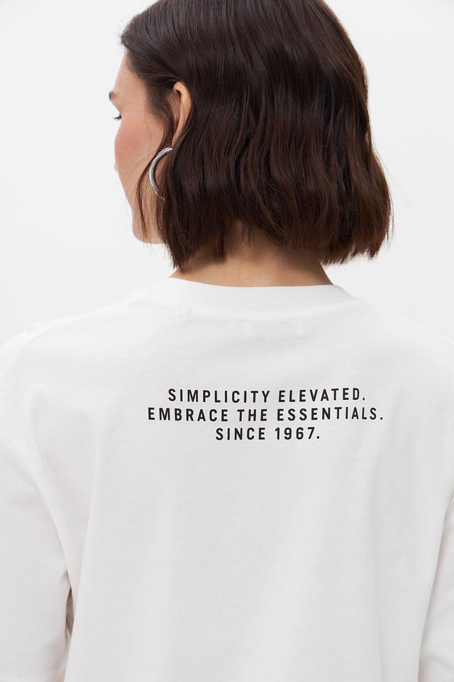 На спине футболки размещена надпись “SIMPLICITY ELEVATED. EMBRACE THE ESSENTIALS. SINCE 1967.”, добавляющая оригинальности образу. Эта футболка идеально сочетается с джинсами, шортами или юбками, создавая стильный и непринужденный образ.