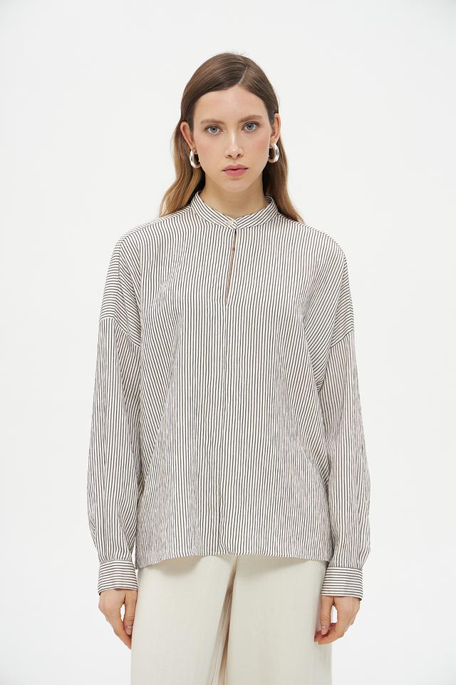 Блузка имеет классический крой с длинными рукавами-фонариками, которые придают образу романтичность и женственность. Воротник-стойка с небольшим разрезом добавляет изысканности. Вертикальная полоска черного и белого цветов визуально вытягивает силуэт и делает фигуру более стройной.