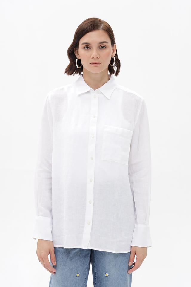 Блуза имеет классический прямой крой, который подходит для любого типа фигуры. Воротник рубашечного типа и застёжка на пуговицы придают ей элегантный вид. На груди расположен накладной карман, добавляющий функциональности и стиля.
