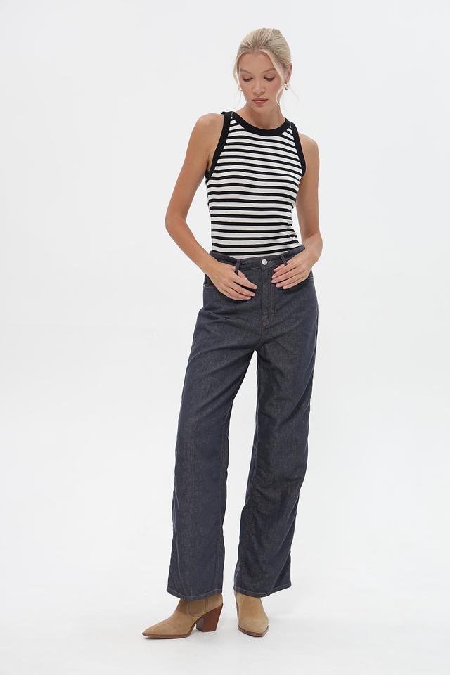 Джинсы имеют высокую посадку, что визуально удлиняет ноги и подчеркивает талию. Классический пятикарманный крой дополнен аккуратными швами и контрастной отстрочкой. Застежка – на металлическую пуговицу и молнию.