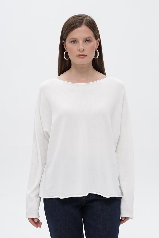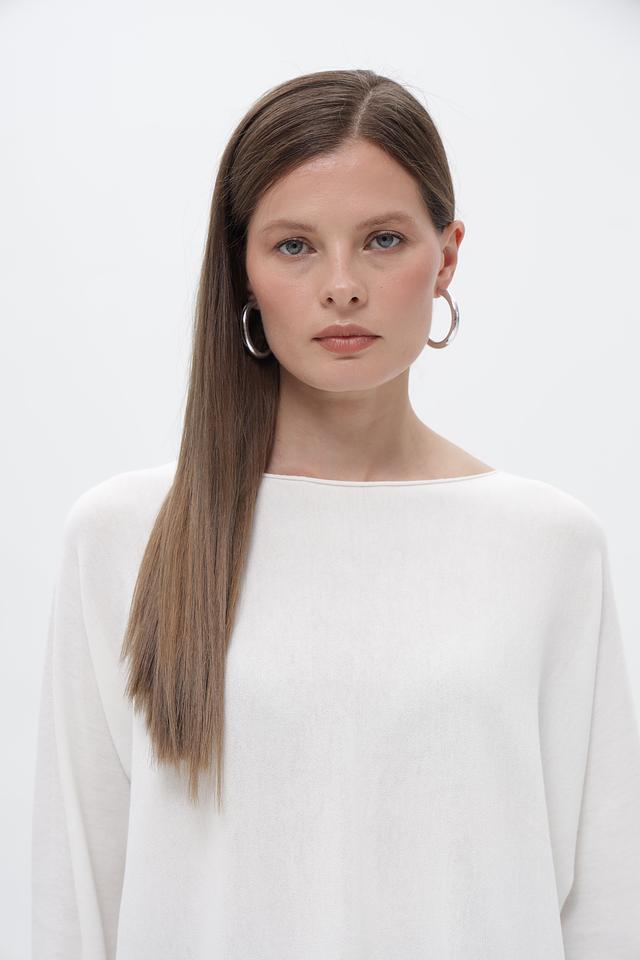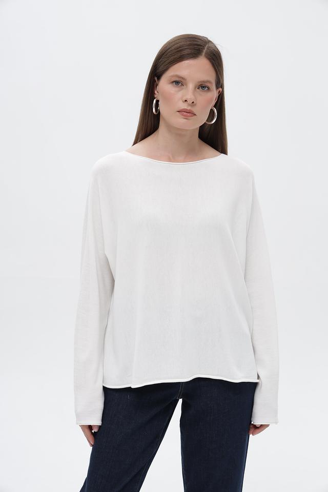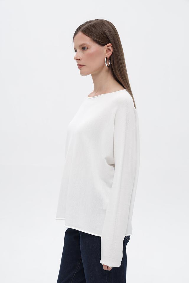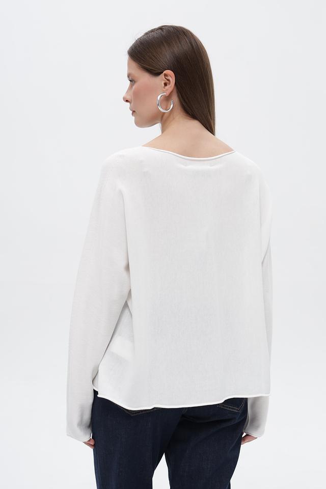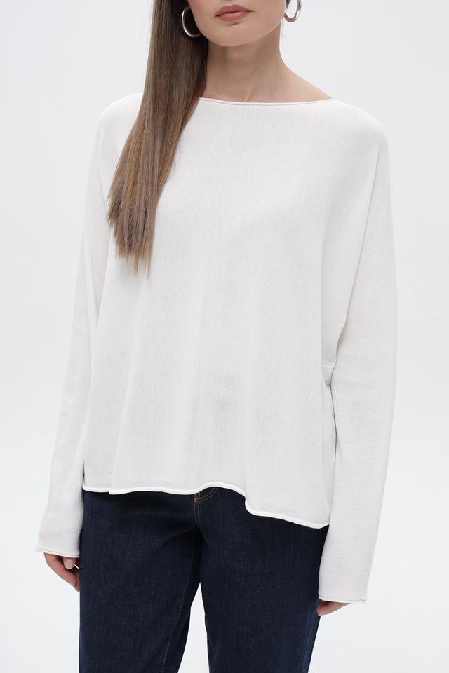 Пуловер отличается лаконичным дизайном с круглым вырезом горловины и длинными рукавами. Неровный подол придает модели оригинальность и делает ее более интересной. Белый цвет пуловера позволяет легко сочетать его с различными элементами гардероба, создавая разнообразные стили.
