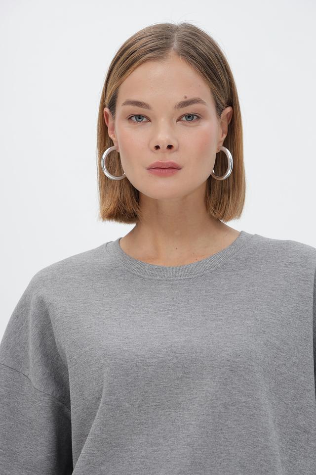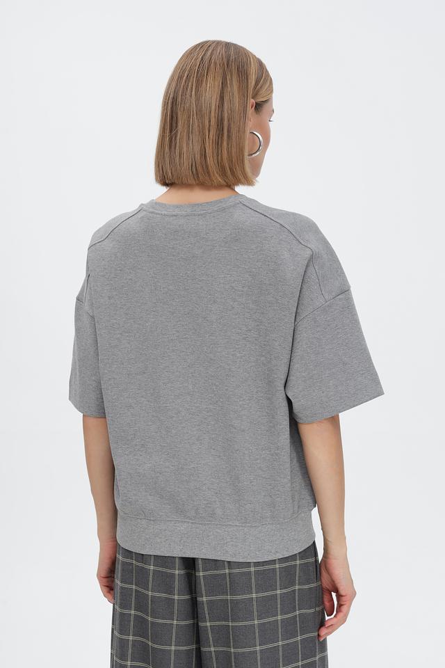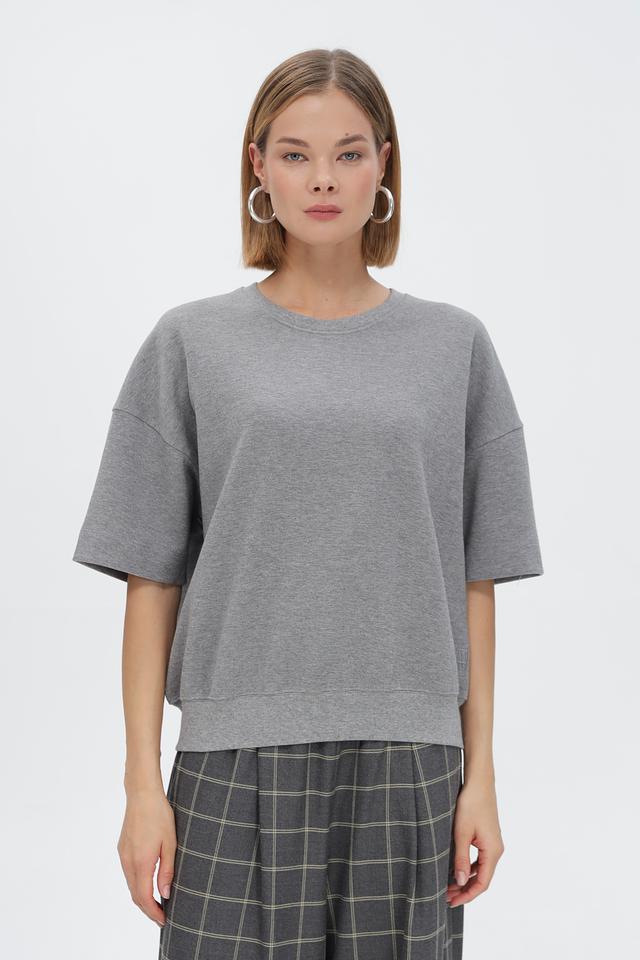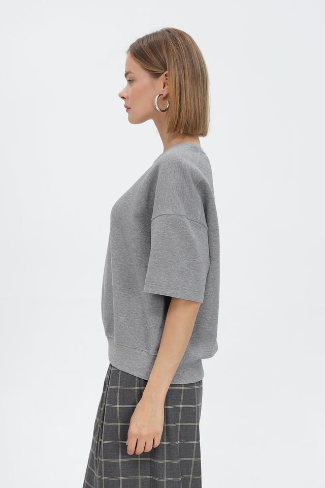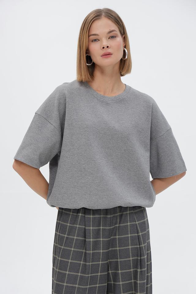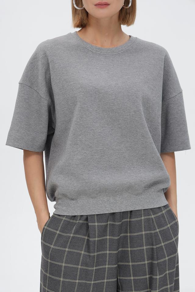 Футболка имеет свободный, слегка заниженный силуэт, что обеспечивает комфортную посадку по фигуре. Классический круглый вырез горловины и короткие рукава делают эту модель универсальной для любого времени года.
