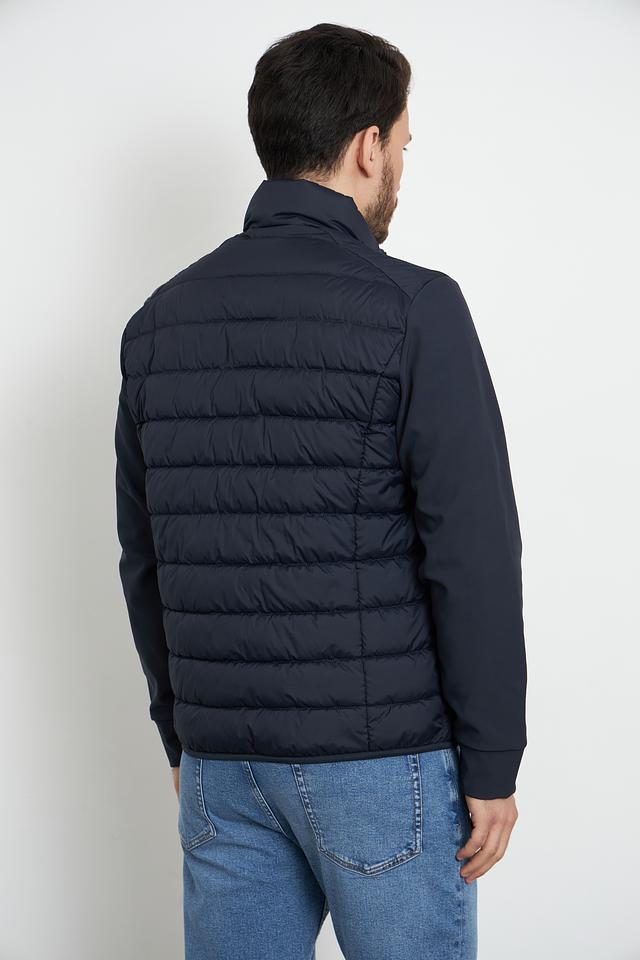 Стильная мужская куртка Marc O Polo синего цвета с комбинированным дизайном. Модель выполнена из полиэстера и имеет стеганую фактуру, а также вставки из гладкой ткани на плечах и рукавах. Состав: полиэстер 100%