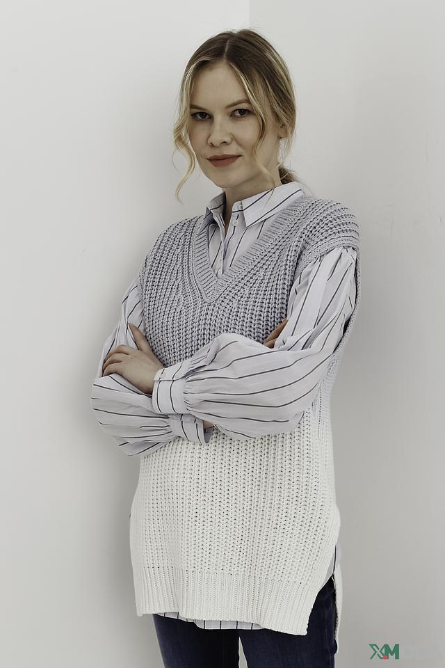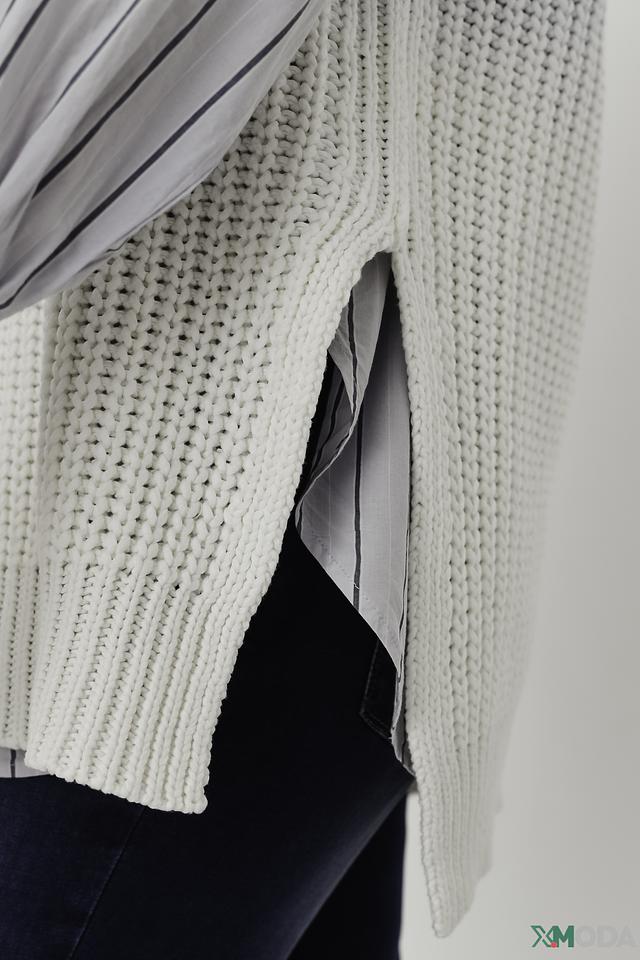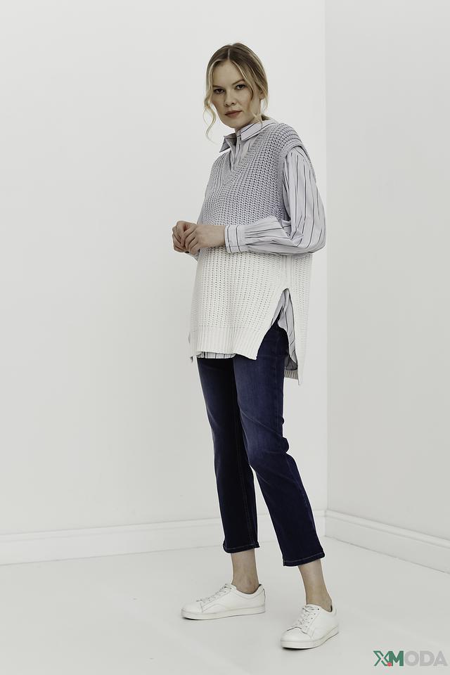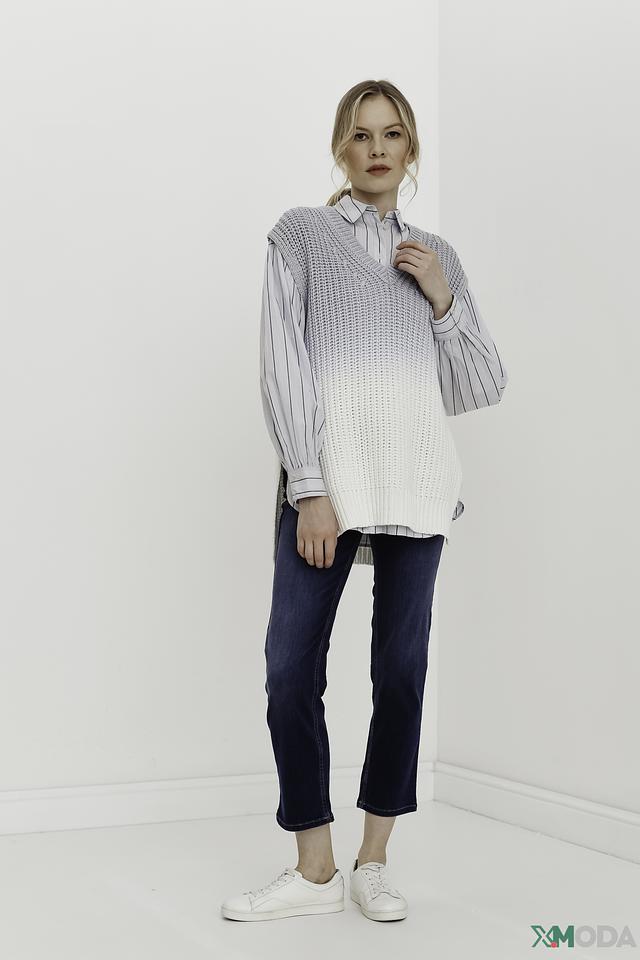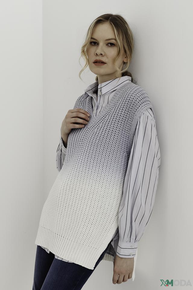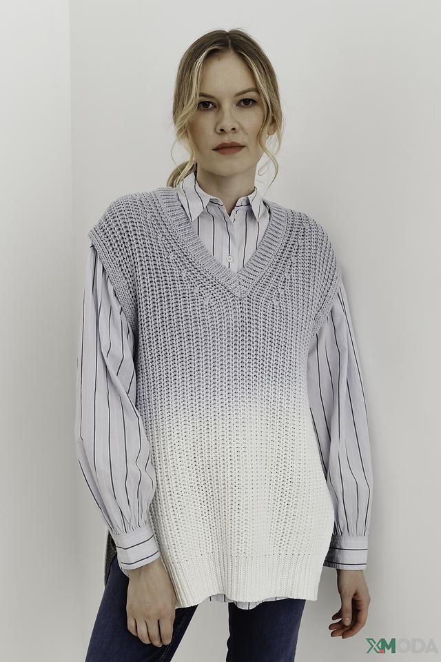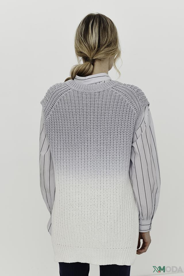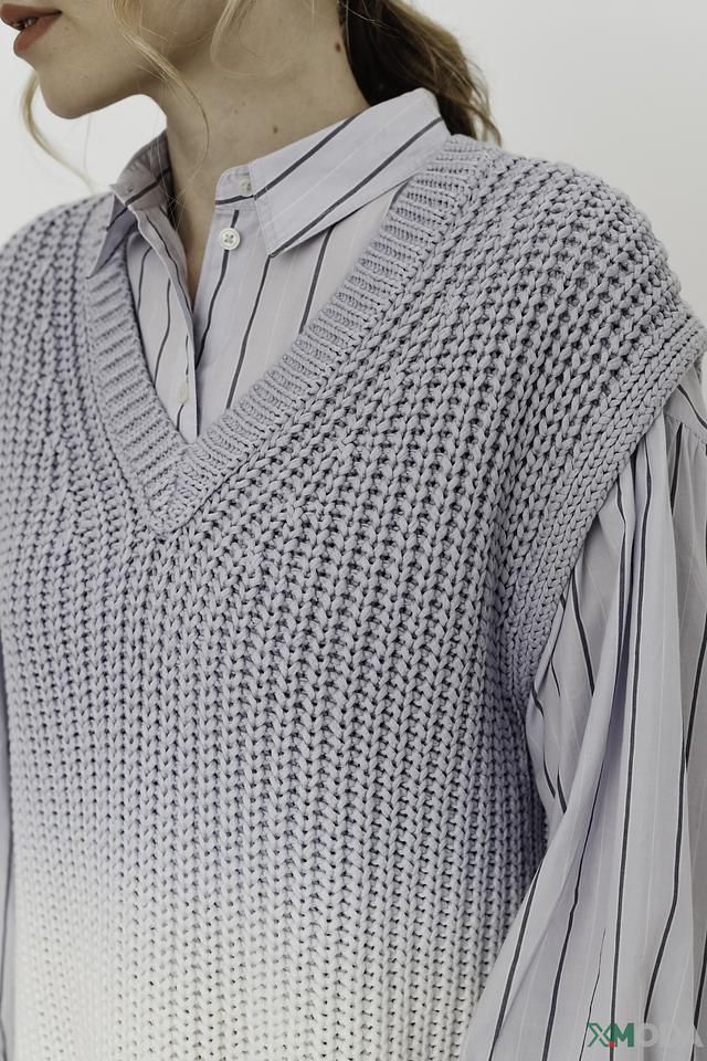 Жилет имеет свободный крой, который не сковывает движений, и V-образный вырез, который визуально удлиняет шею. Градиентный переход от серого к белому придает изделию оригинальность и современный вид.