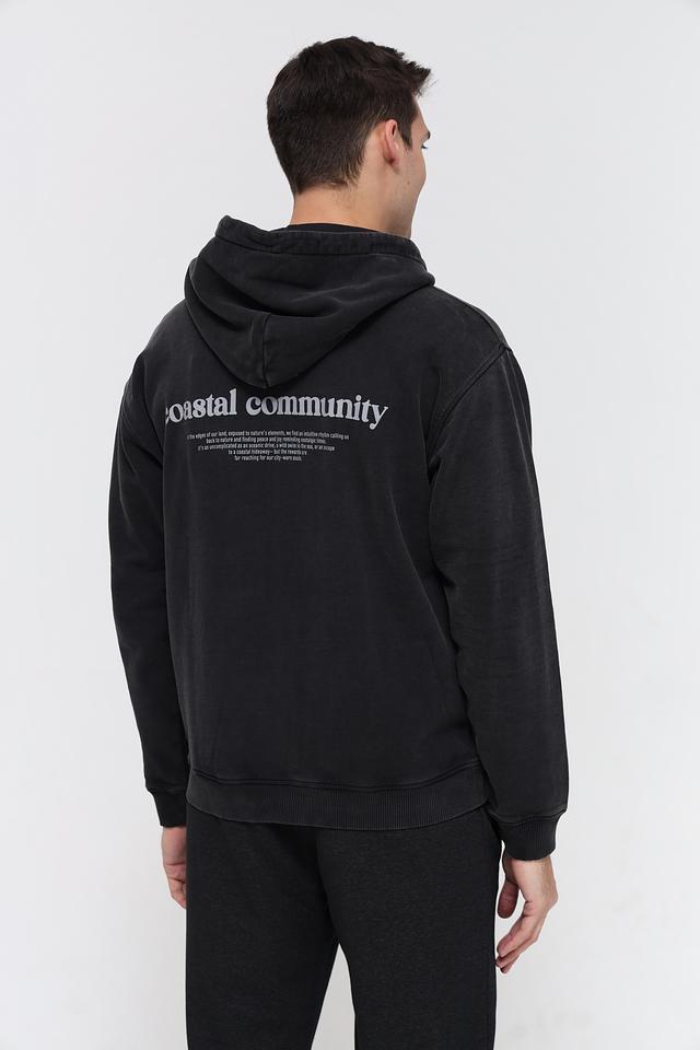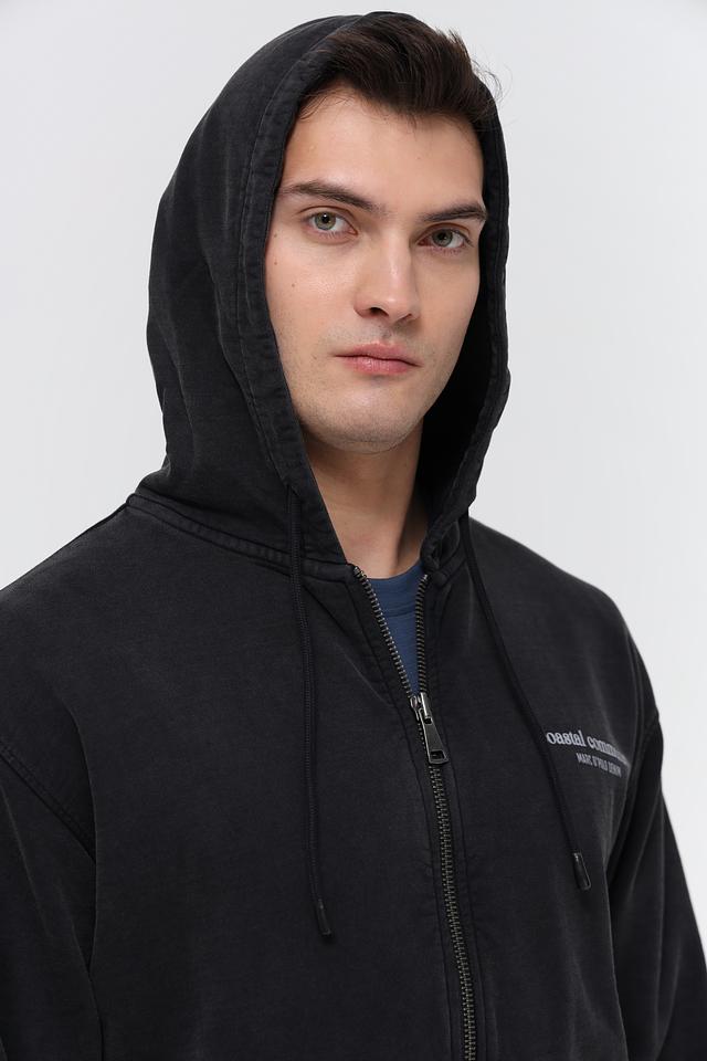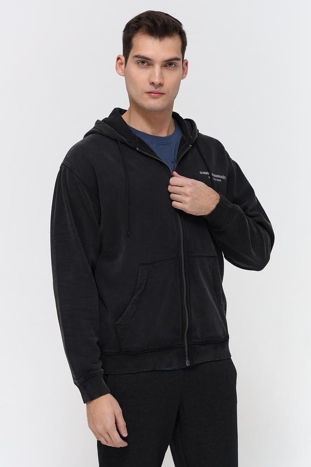 Кардиган имеет удобный капюшон и застёжку на молнии, что позволяет регулировать степень защиты от ветра и холода. На груди и спине размещены принты и надписи, добавляющие изделию индивидуальности и стиля.