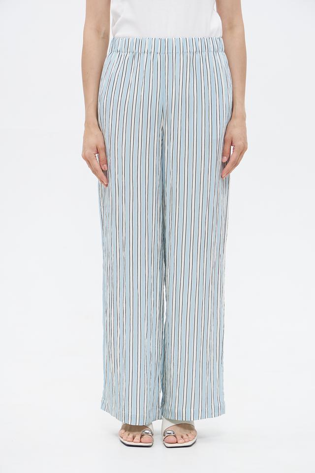 Модель имеет прямой крой и широкие штанины, создающие расслабленный и современный силуэт. Эластичный пояс обеспечивает удобную посадку по фигуре. Брюки выполнены в оригинальной полосатой расцветке, сочетающей в себе голубые, белые и серые оттенки.