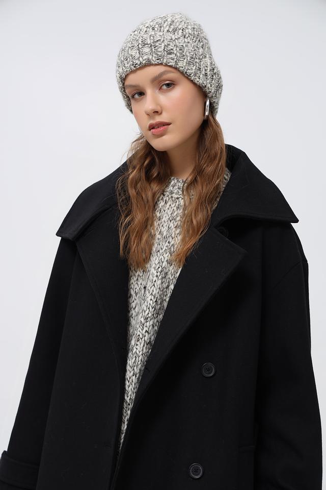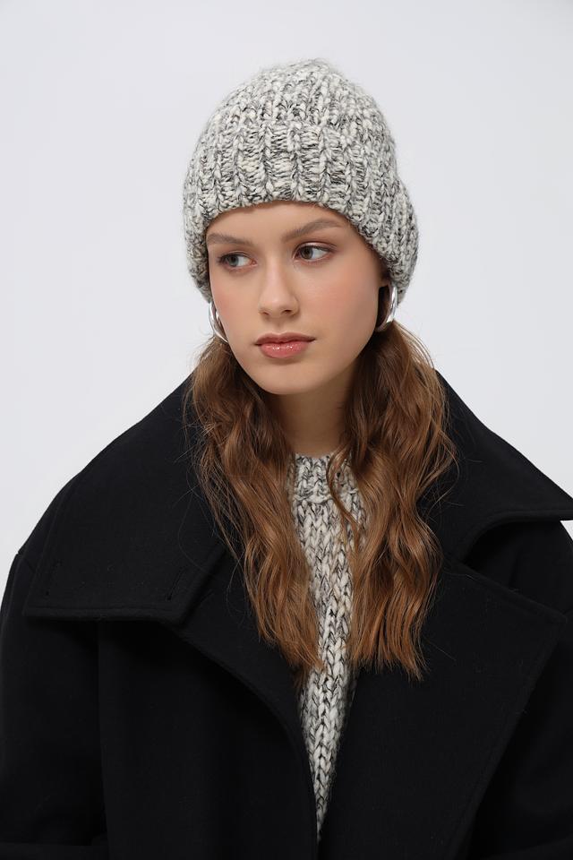 Шапка выполнена в сером цвете с меланжевым эффектом, создающим интересный визуальный эффект. Текстура вязки добавляет изделию объём и уют.