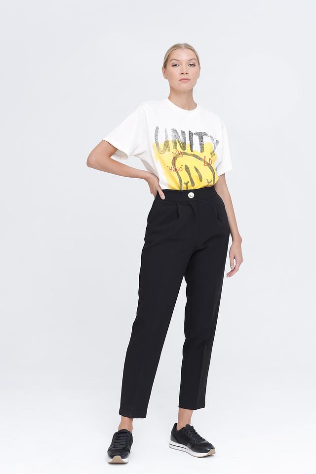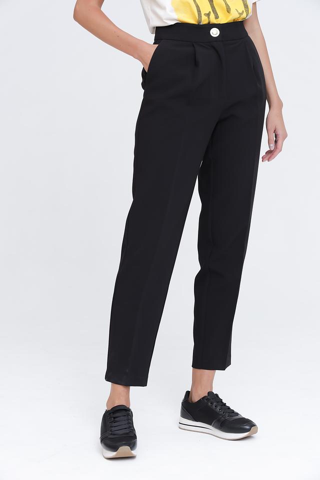 Брюки имеют прямой крой и высокую посадку, что визуально удлиняет ноги и подчеркивает талию. Аккуратные складки на передней части добавляют изысканности и элегантности. Модель выполнена из сочетания полиэстера (74%), вискозы (19%) и эластана (7%), что обеспечивает комфорт, хорошую посадку и лёгкость в уходе.