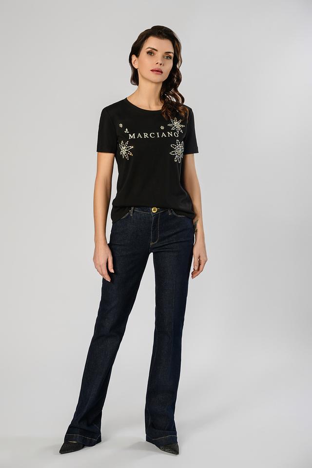 Чёрная футболка Marciano с коротким рукавом, украшенная сверкающими кристаллами и логотипом бренда. Изготовлена из мягкого и приятного к телу сочетания хлопка и модала. Состав: хлопок 50%, модал 50%
