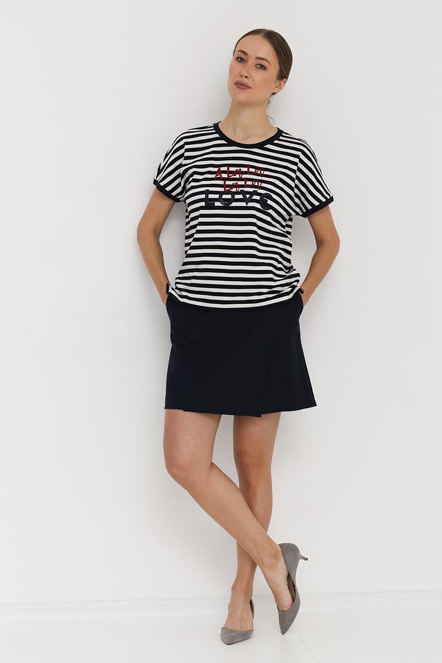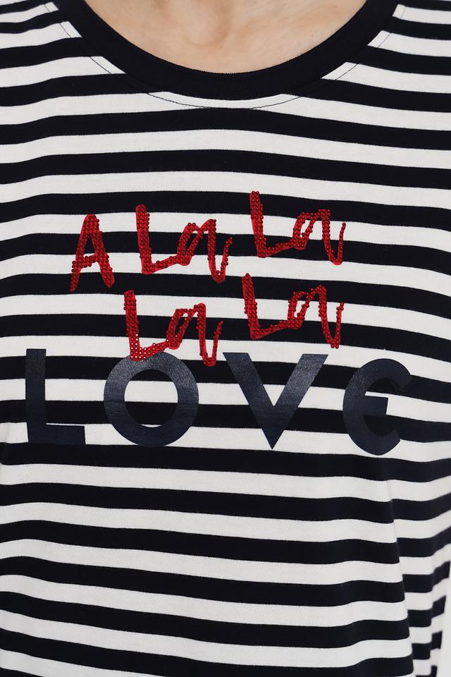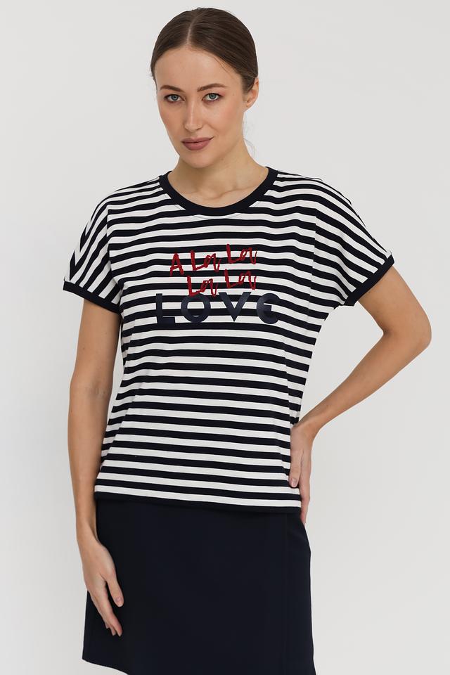 Женская футболка Margittes выполнена в классической черно-белой полоску и украшена ярким принтом. Изготовлена из 100% хлопка, обеспечивая комфорт и воздухопроницаемость. Состав: хлопок 100%