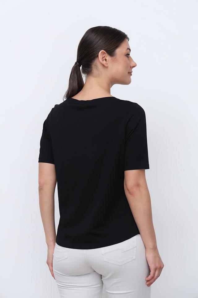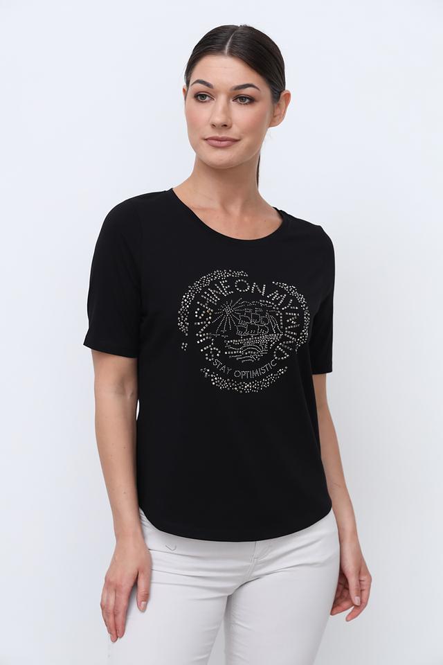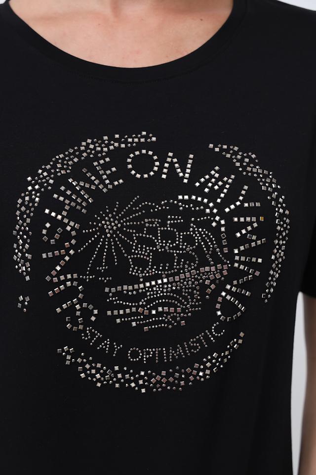 Основной цвет футболки – чёрный, который легко сочетается с другими элементами одежды. Главная особенность модели – эффектный декор, выполненный в виде надписи и рисунка, инкрустированных мерцающими элементами. Этот декор придает футболке изысканность и оригинальность.