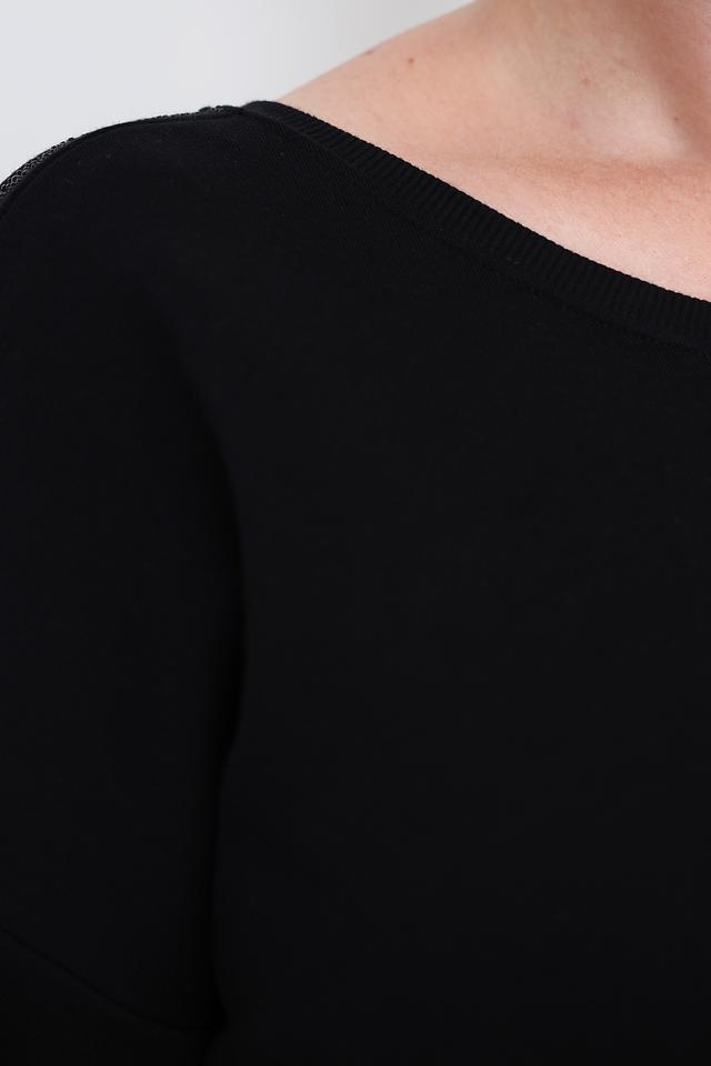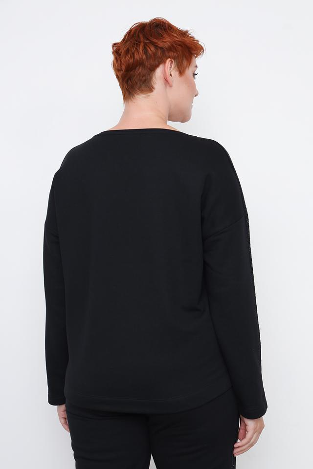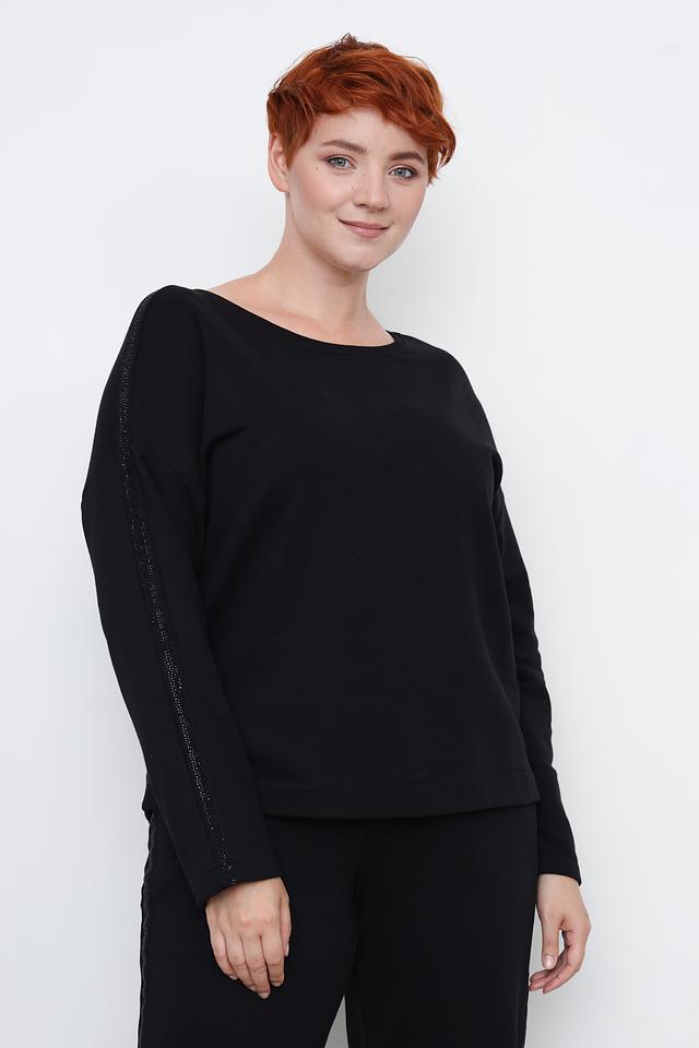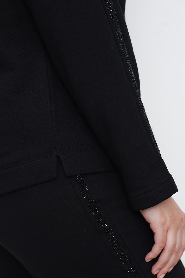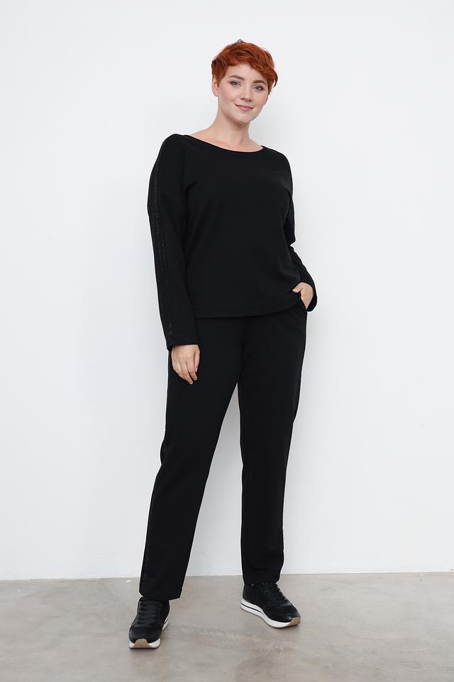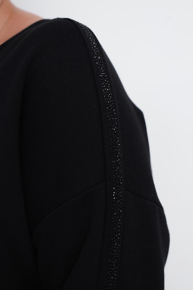 Особенностью модели является декоративная отделка на рукавах, выполненная в виде страз, придающая изделию изысканность и блеск. Пуловер имеет свободный крой и круглый вырез горловины, что делает его универсальным и подходящим для различных стилей.