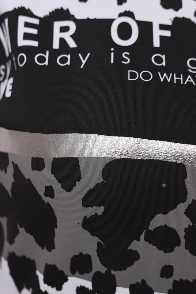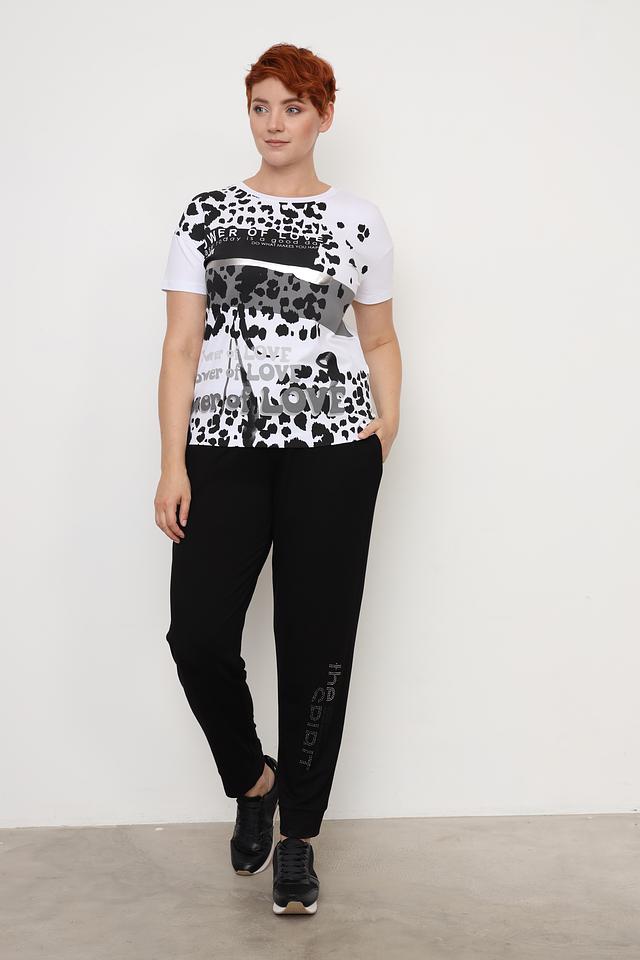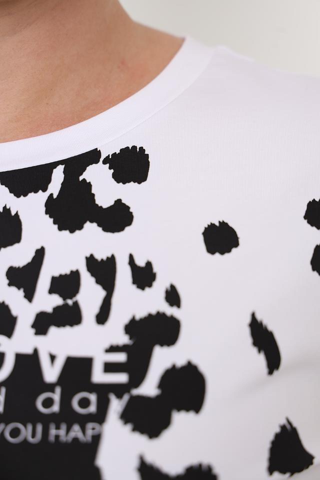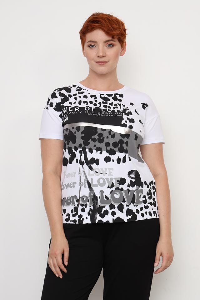 Основной цвет футболки – белый, а главным элементом дизайна является эффектный леопардовый принт, выполненный в чёрно-серых тонах. Дополнительно футболка украшена надписью "Power of Love", которая добавляет ей индивидуальности.