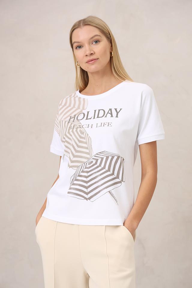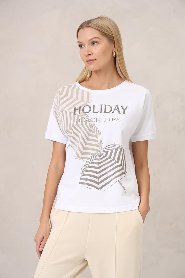 Основной цвет футболки – белый, который служит идеальным фоном для оригинального принта. Дизайн украшен изображением пляжных зонтиков в полоску и надписью "HOLIDAY BEACH LIFE", выполненной в сочетании графитовых и серебристых оттенков.