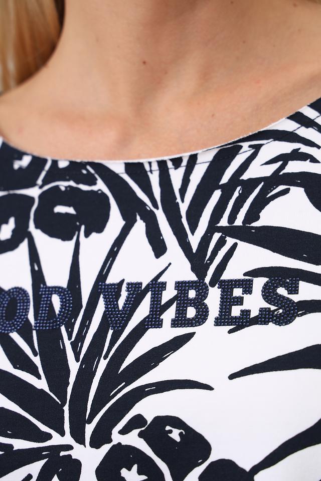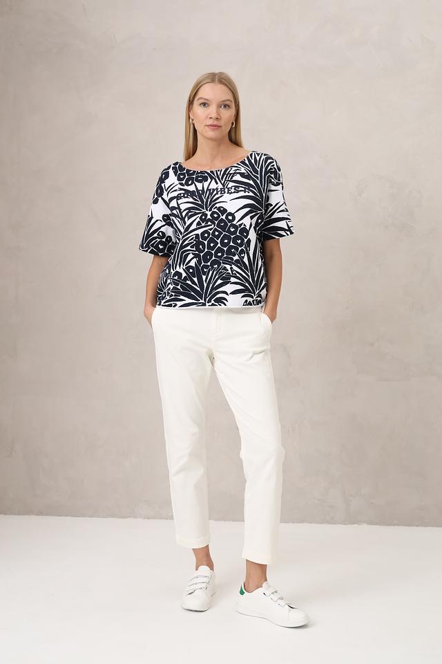 Белая блуза Margittes с ярким чёрно-белым тропическим принтом и короткими рукавами. Изготовлена из мягкого хлопка с добавлением эластана для комфорта и свободы движений. Стильный и удобный выбор для повседневного образа. Состав: хлопок 97%, эластан 3%