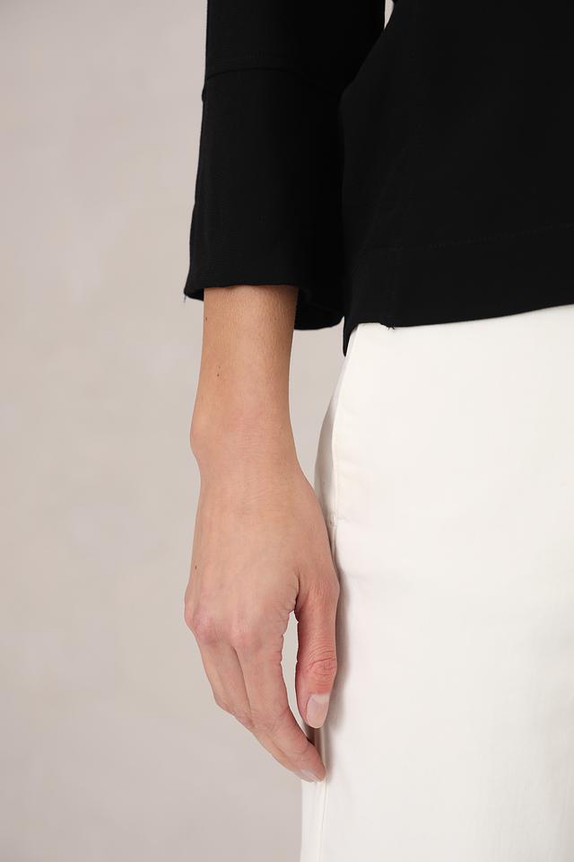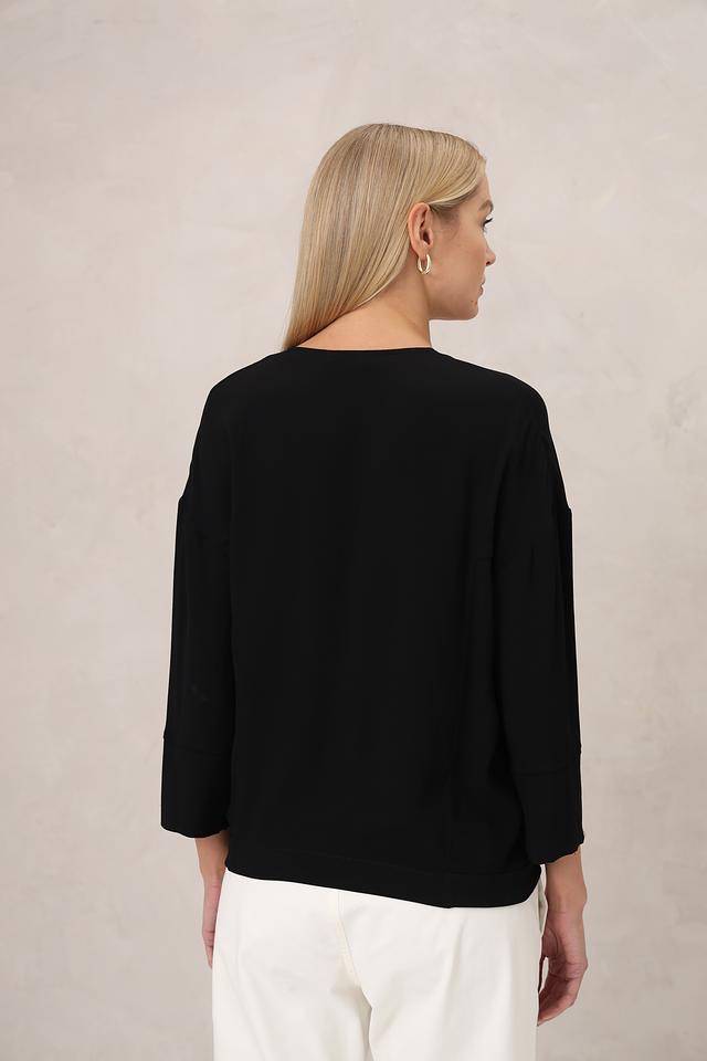 Чёрная блуза от Margittes выполнена из мягкого лиоцела и имеет удобный V-образный вырез. Эта модель с рукавом 3/4 станет отличным дополнением к вашему гардеробу, сочетая в себе комфорт и элегантность. Состав: лиоцел 100%