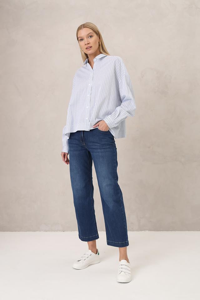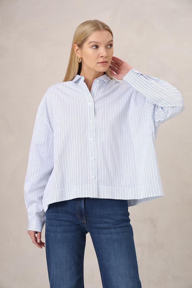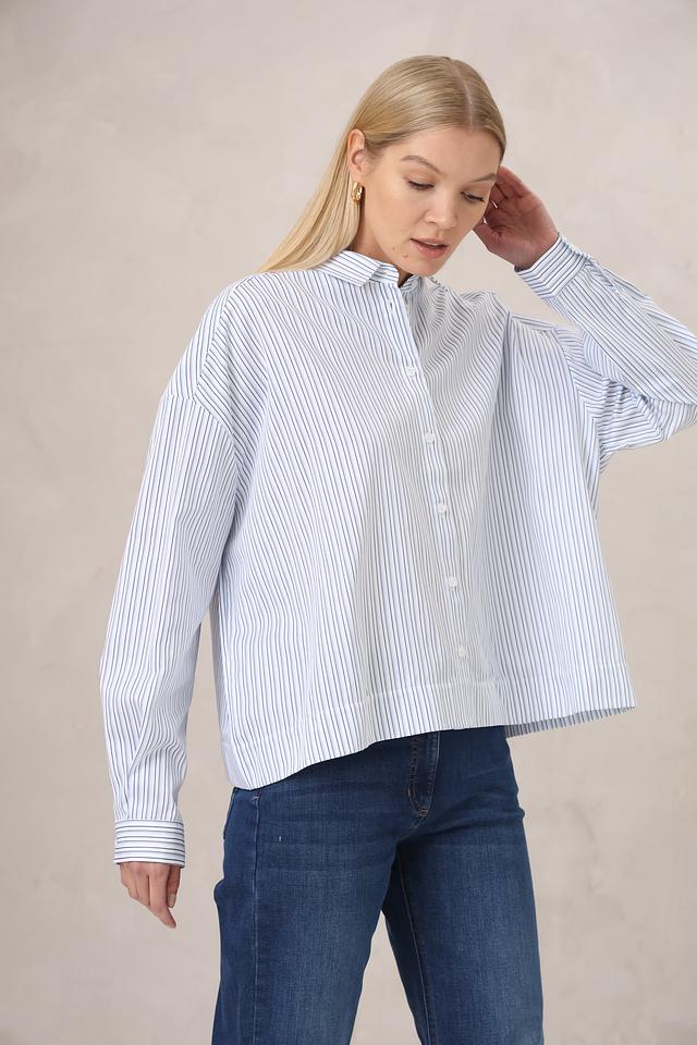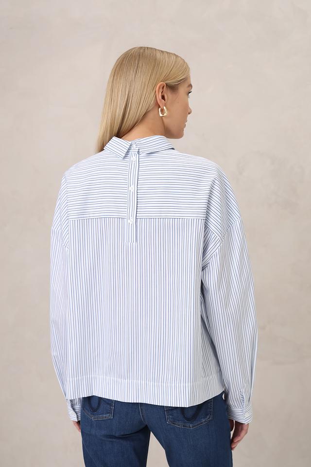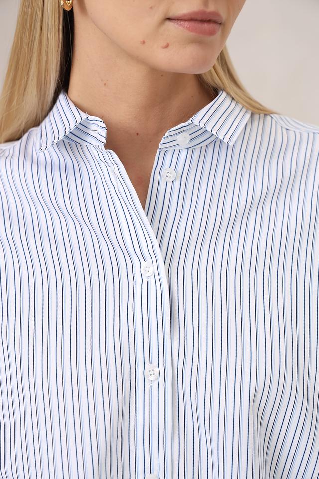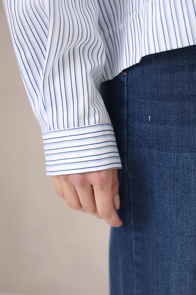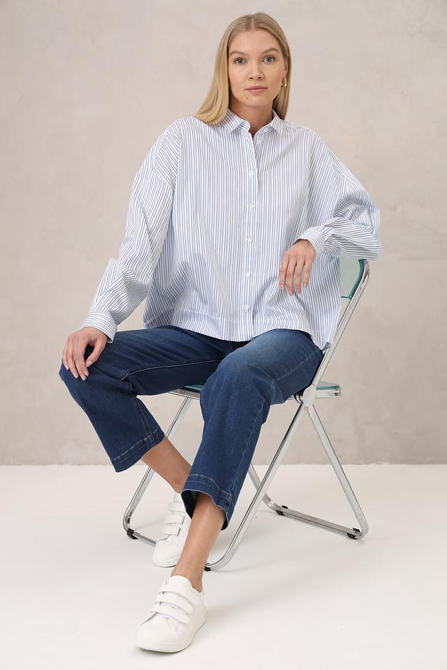 Голубая полоска придает рубашке свежий и современный вид, делая ее универсальной для различных стилей и случаев. Она прекрасно сочетается с джинсами, брюками или юбками, и может быть как самостоятельным элементом образа, так и частью многослойного наряда.