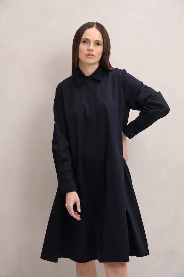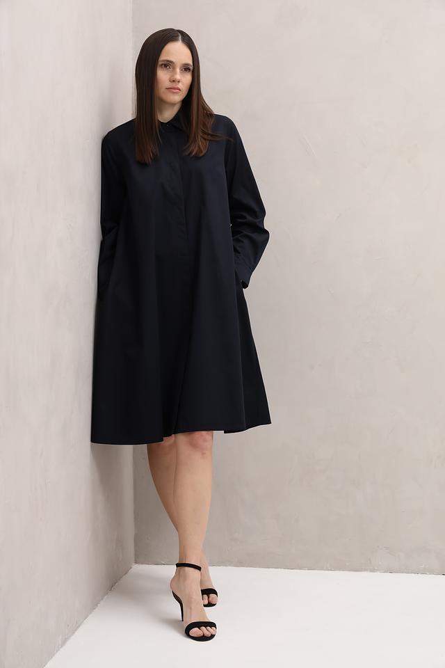 Это платье рубашка от бренда Margittes выполнено в тёмно-синем цвете. Модель имеет прямой, слегка расклешенный силуэт, который обеспечивает комфорт и свободу движений.