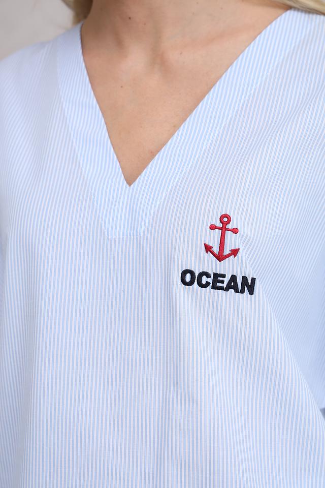 На груди блузы расположена вышивка в морском стиле – якорь и надпись “OCEAN”. Сбоку изделия имеется небольшой разрез. Эта блуза идеально сочетается с джинсами, брюками или юбками, создавая непринужденный и стильный образ.
