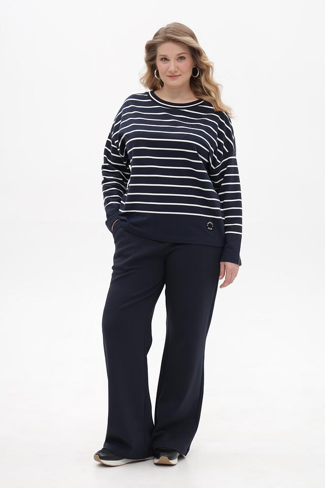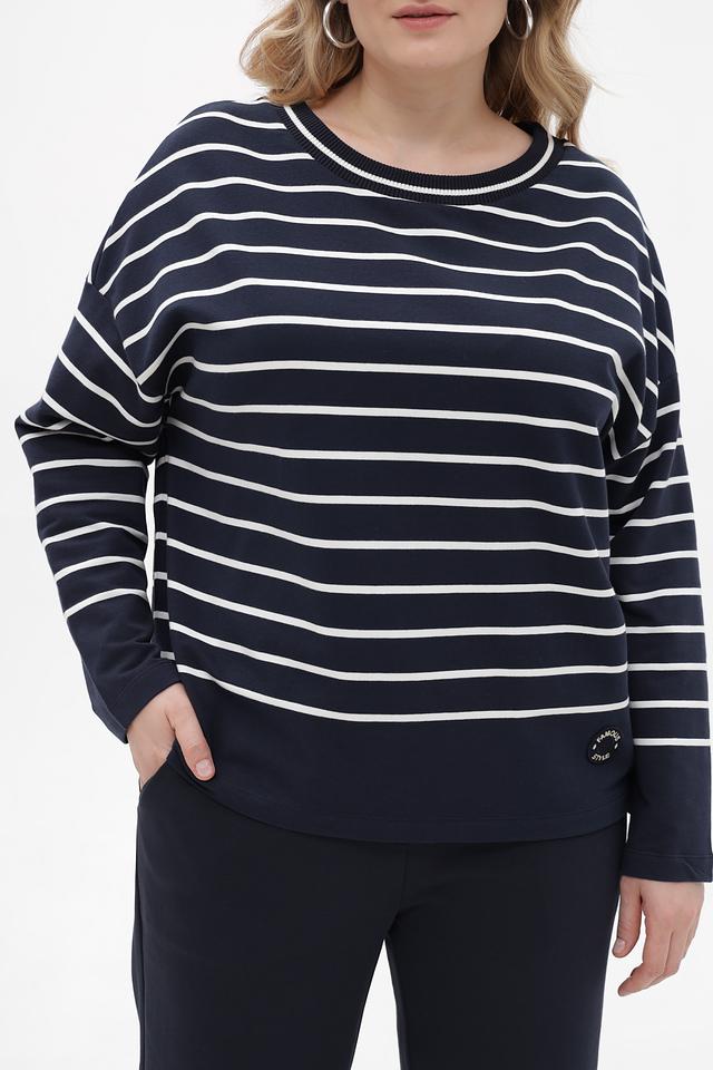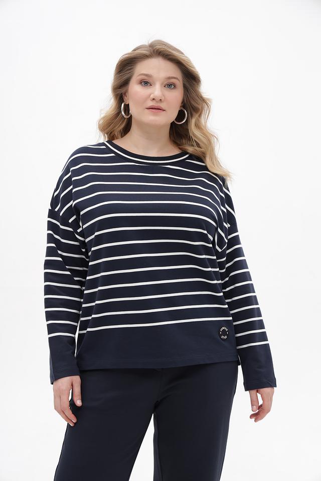 Основной цвет футболки – насыщенный синий, дополненный горизонтальными полосами белого цвета. Такой рисунок визуально освежает образ и подходит практически к любому типу фигуры. На рукаве расположена небольшая декоративная вставка с логотипом бренда.
