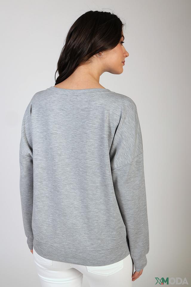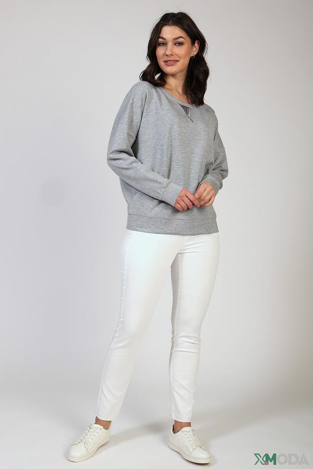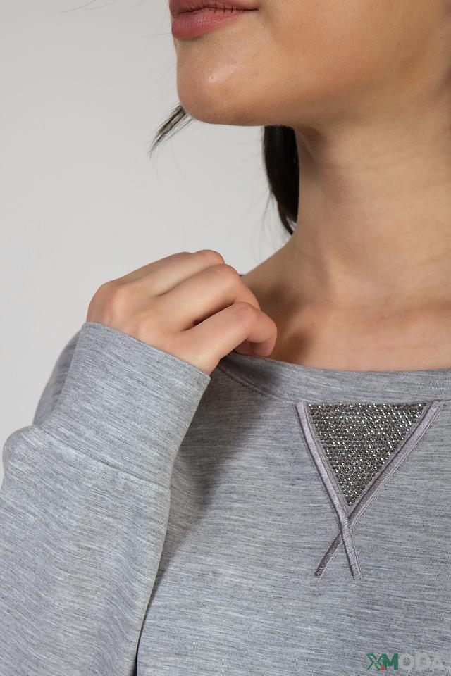 Пуловер имеет серый меланжевый цвет и V-образный вырез горловины, который декорирован треугольной вставкой, расшитой стразами. Этот элемент придает изделию изысканность и оригинальность.