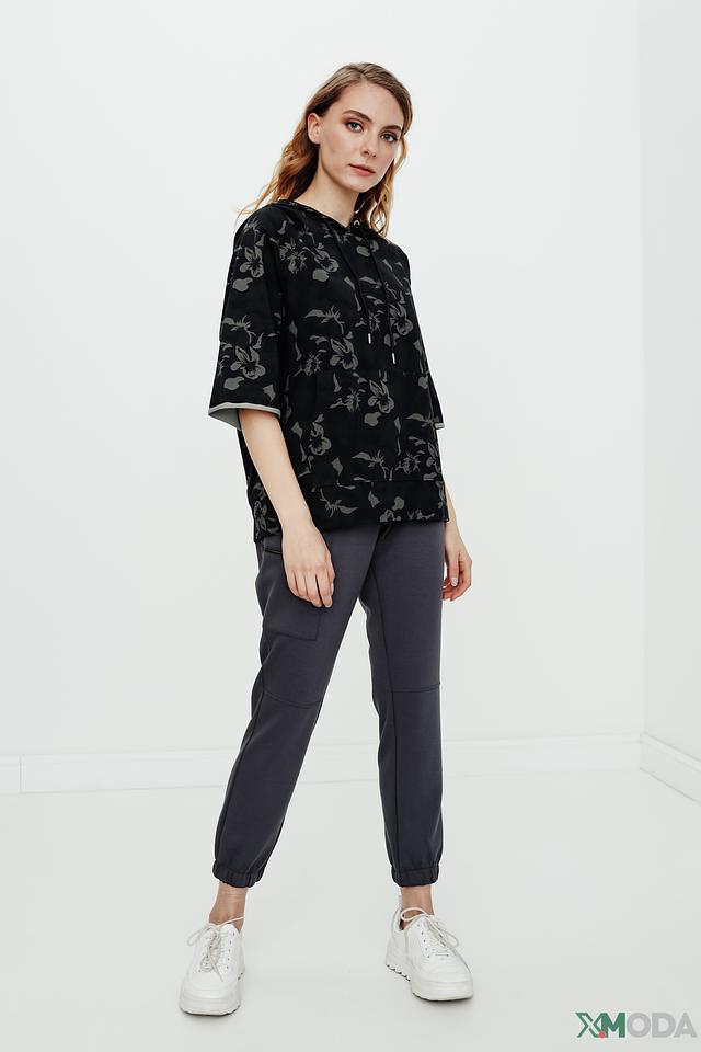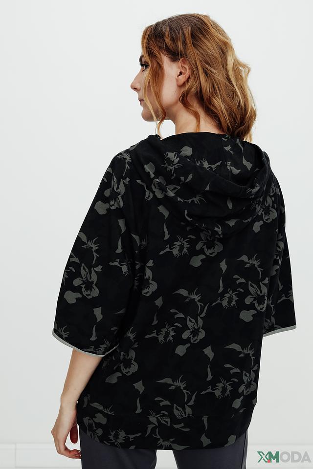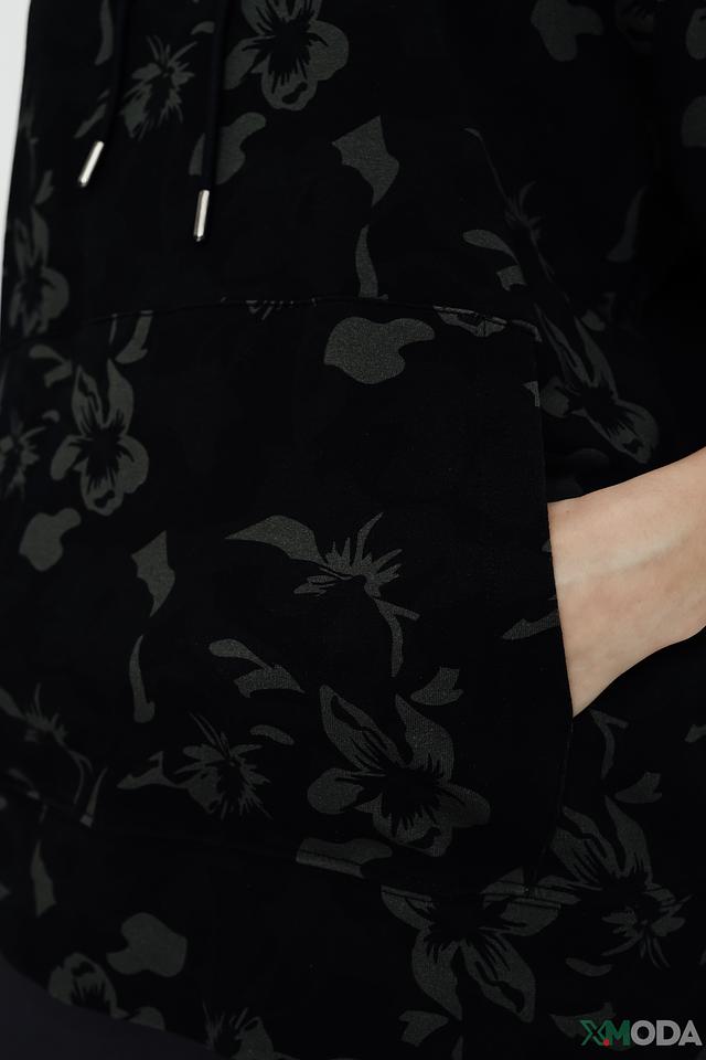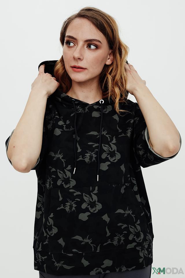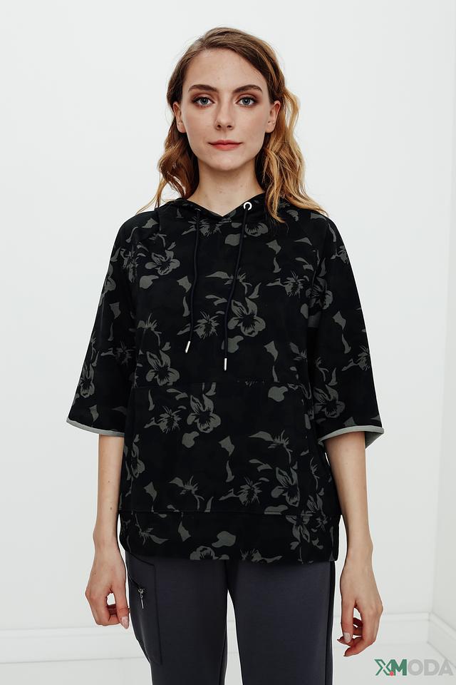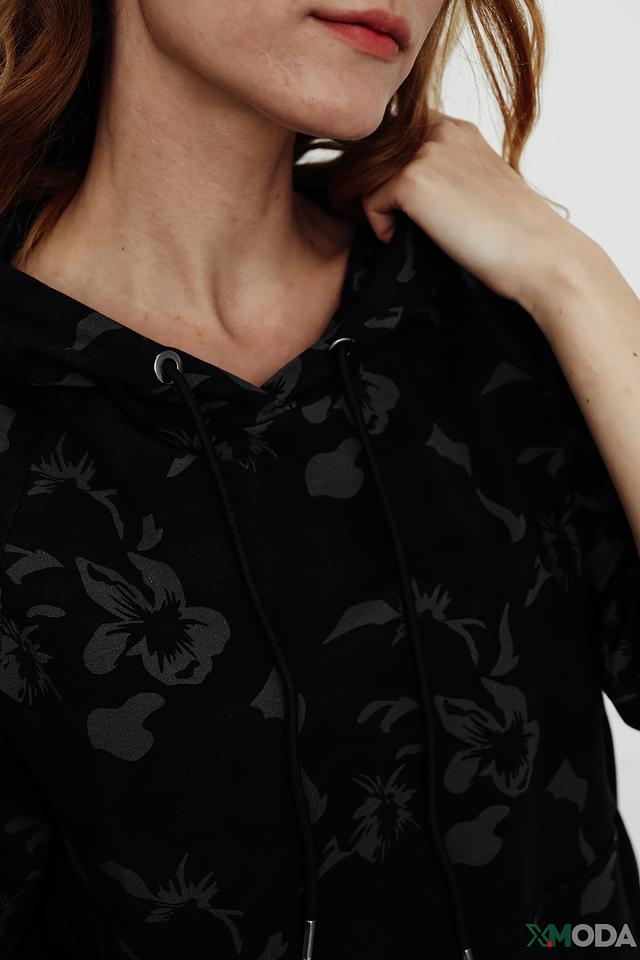 Пуловер имеет чёрный цвет и украшен оригинальным цветочным принтом, который придает ему особый шарм. Модель оснащена капюшоном и короткими рукавами, что делает ее идеальным выбором для теплой погоды.