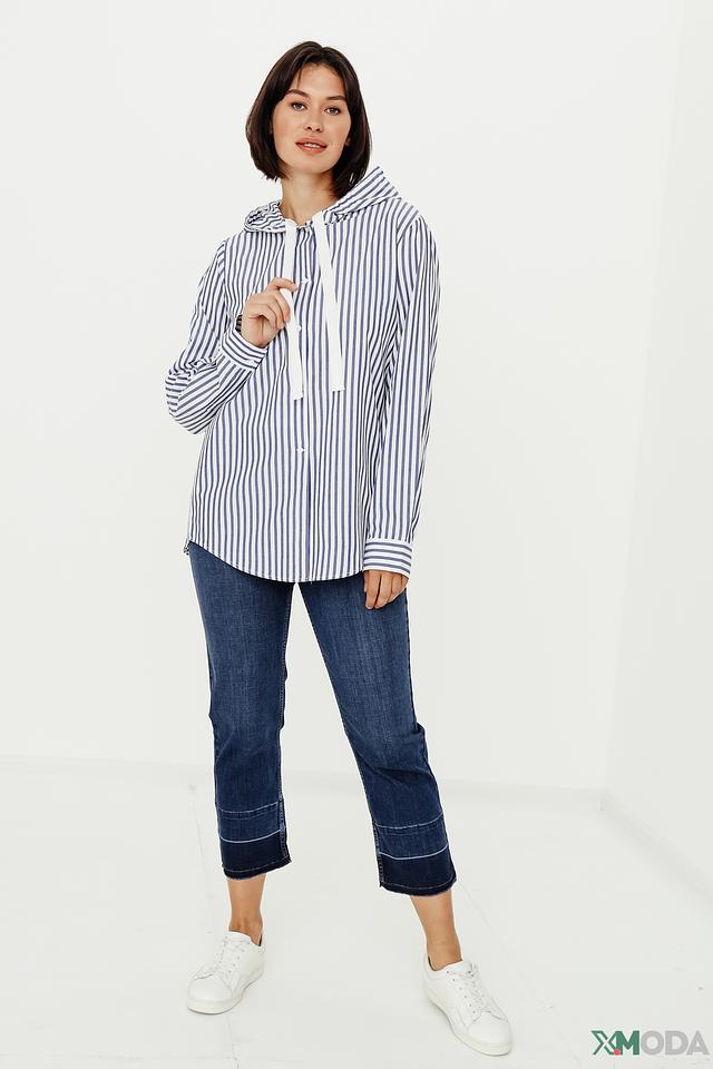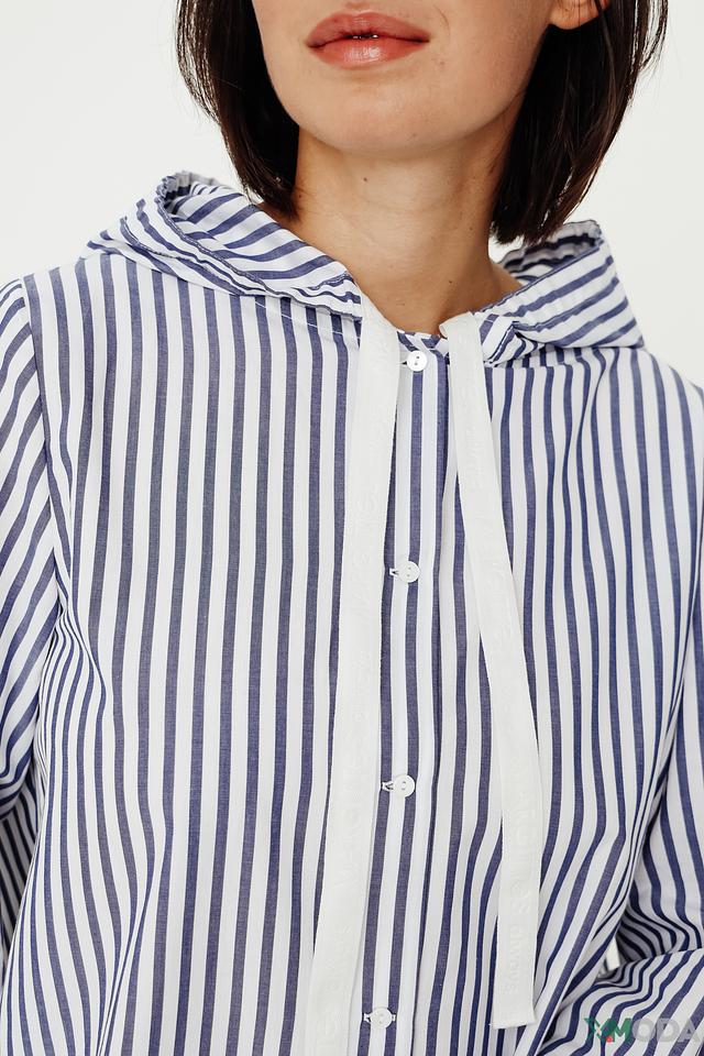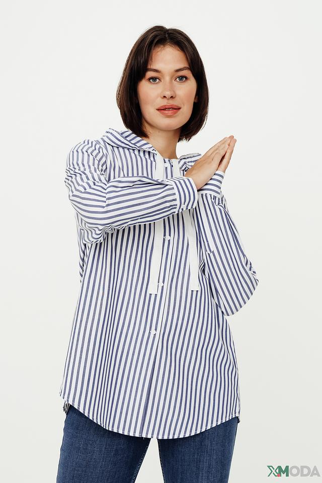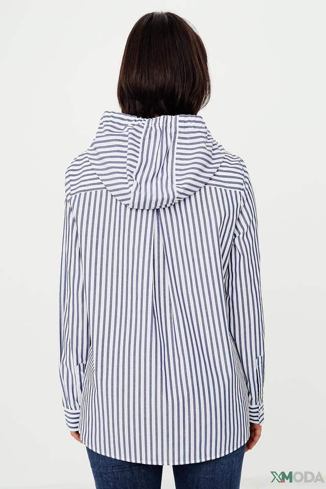 Женская рубашка Margittes синего цвета в белую полоску с капюшоном и длинными рукавами. Изготовлена из 100% хлопка, обеспечивающего комфорт и воздухопроницаемость. Стильный и удобный вариант для повседневного образа. Состав: хлопок 100%