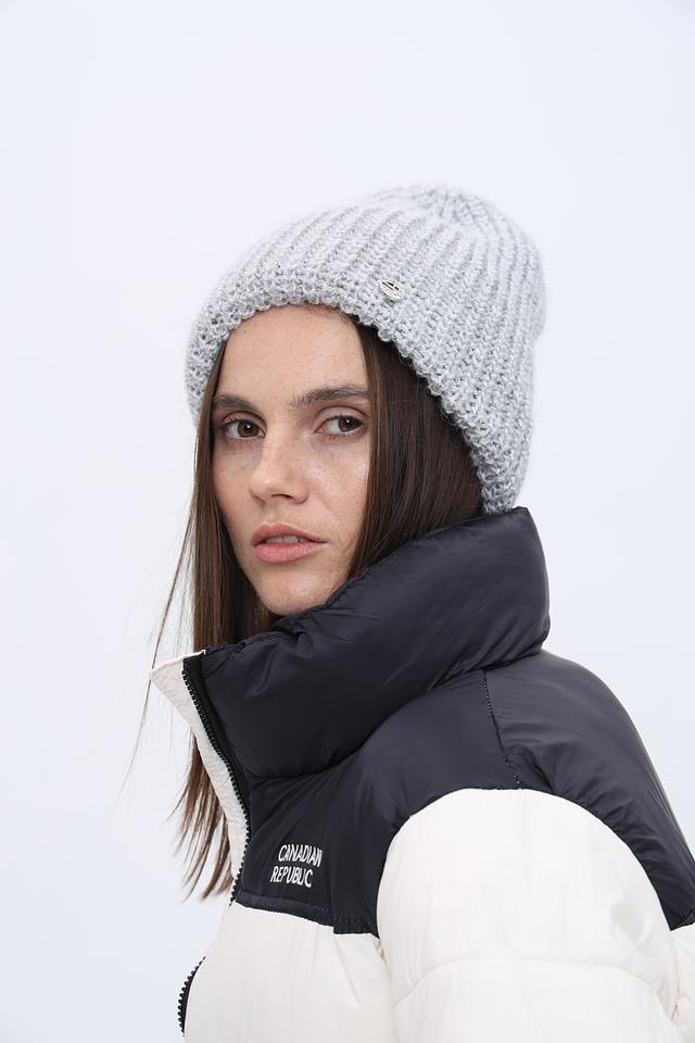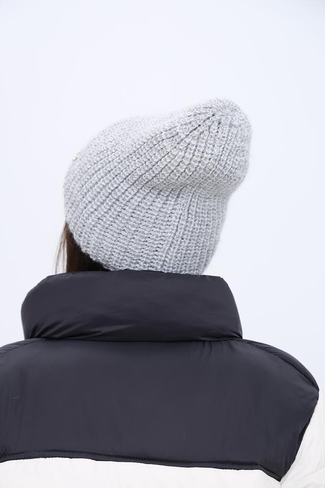 Шапка имеет классический дизайн и нейтральный серый цвет, который легко сочетается с любой одеждой. Текстурное вязаное полотно придает шапке объем и уютный вид. Она плотно прилегает к голове, защищая от ветра и холода.