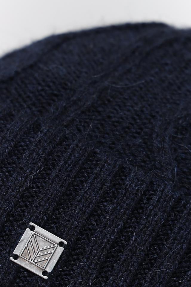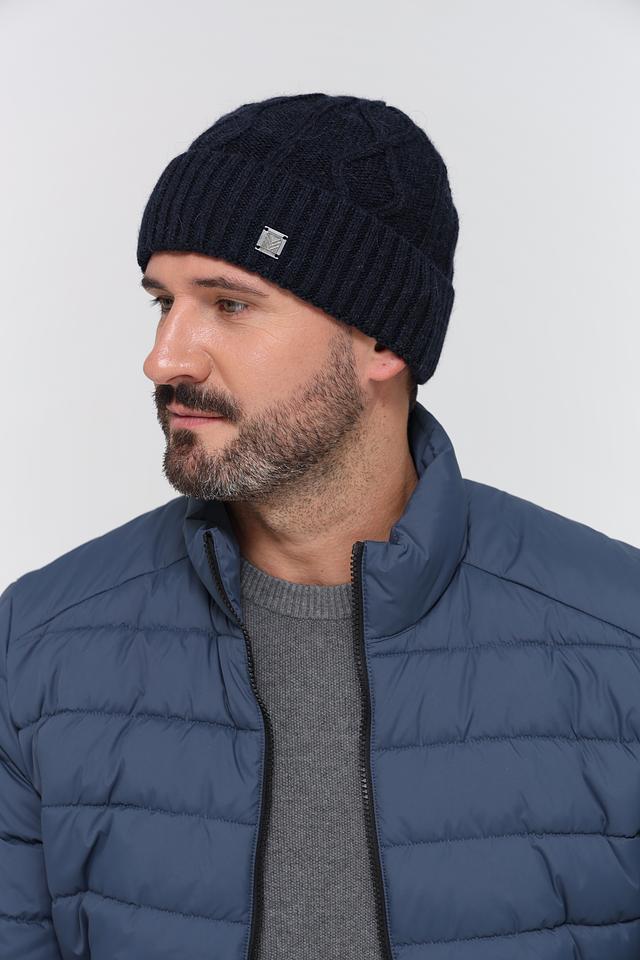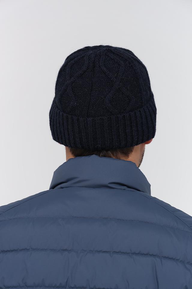 Шапка выполнена в классическом тёмно-синем цвете, который легко сочетается с различными стилями одежды. Рельефный узор в виде кос придает шапке текстуру и визуальный интерес. Небольшой металлический логотип бренда добавляет изысканности.