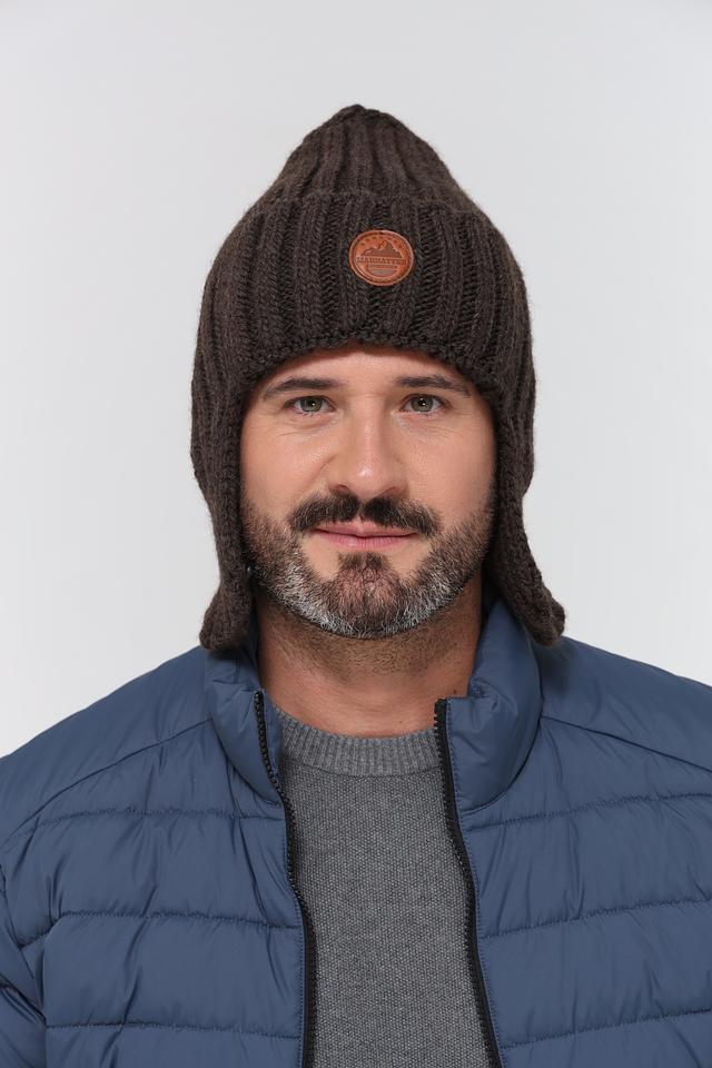 Шапка имеет классический дизайн с вязаной текстурой и удобными ушами, которые надёжно защищают от ветра и мороза. Коричневый цвет делает её универсальной и легко сочетаемой с различной одеждой.