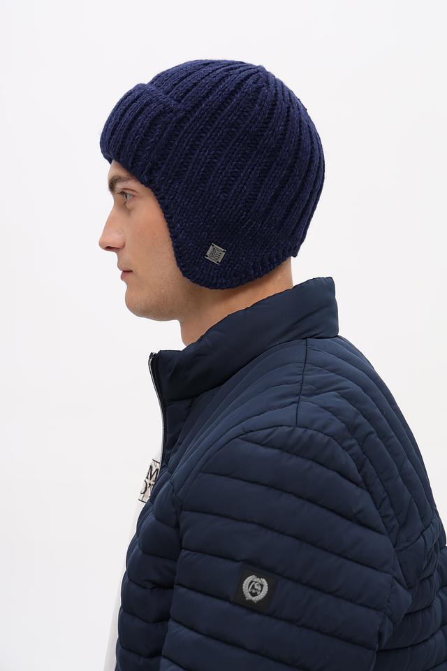 Шапка выполнена в насыщенном синем цвете и имеет классический дизайн с отворотами. Вязаная текстура придает шапке уютный вид. Сбоку шапки расположен небольшой металлический логотип бренда, который добавляет узнаваемости.