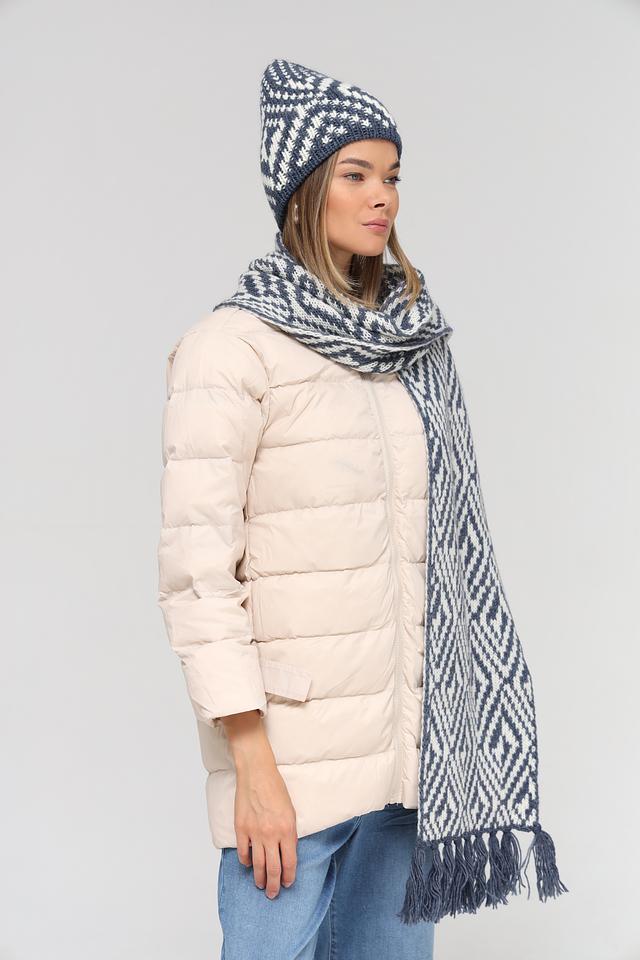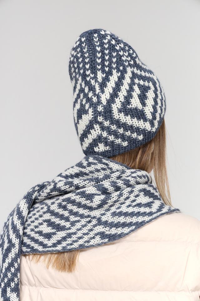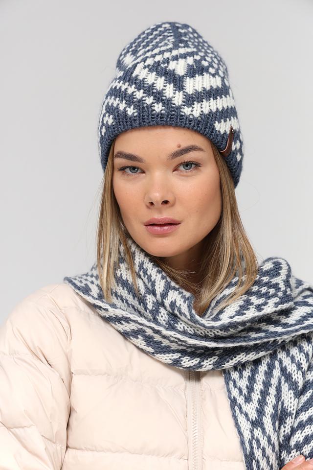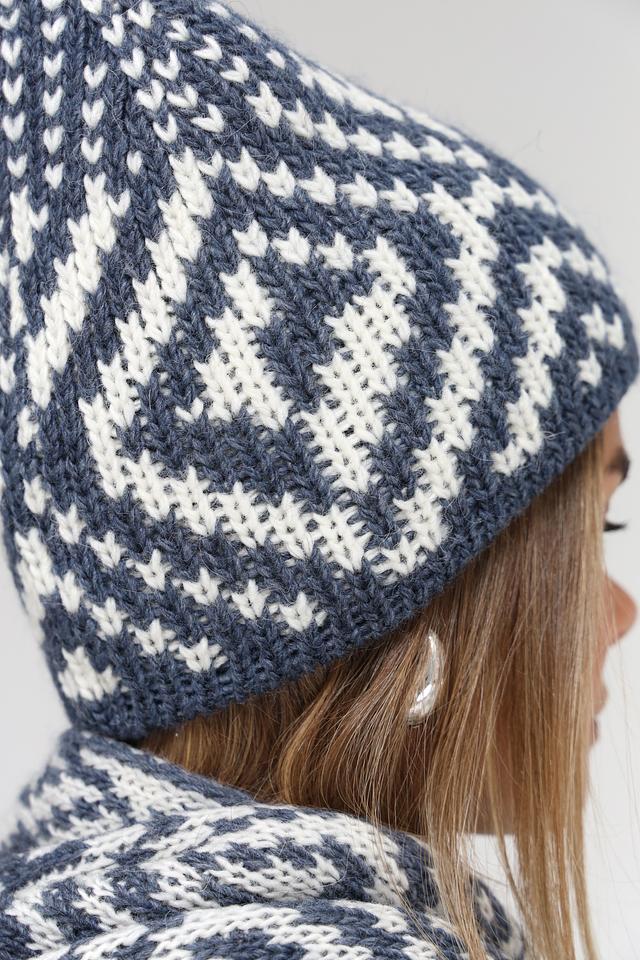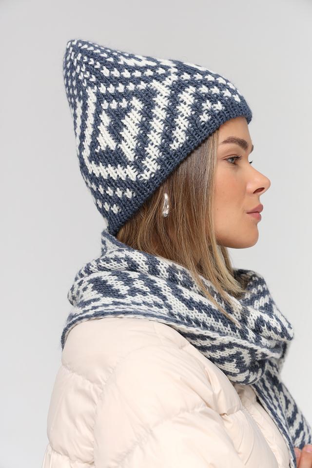 Шапка имеет классическую форму и украшена выразительным геометрическим узором в синих и белых тонах. Этот узор придает шапке особый шарм и делает ее универсальным аксессуаром, который подойдет к различным стилям одежды.