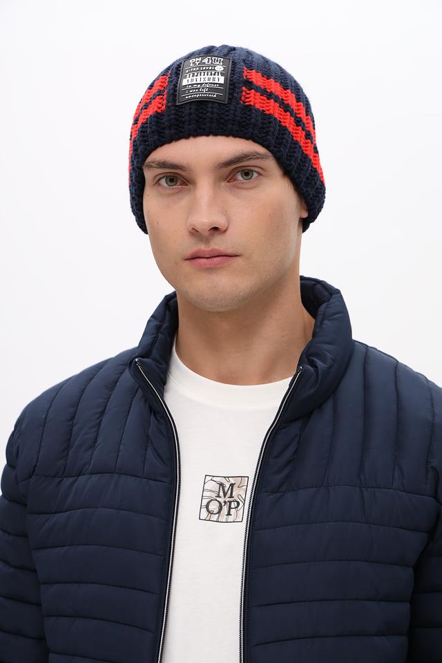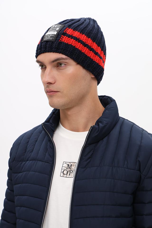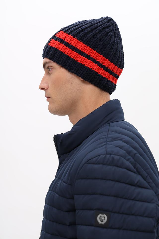 Мужская шапка Marhatter тёмно-синего цвета с яркими красными полосами. Изготовлена из мягкого сочетания полиакрила и шерсти, обеспечивая комфорт и тепло в холодное время года. Шапка дополнена нашивкой с логотипом бренда. Состав: полиакрил 70%, шерсть 30%