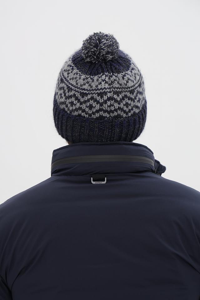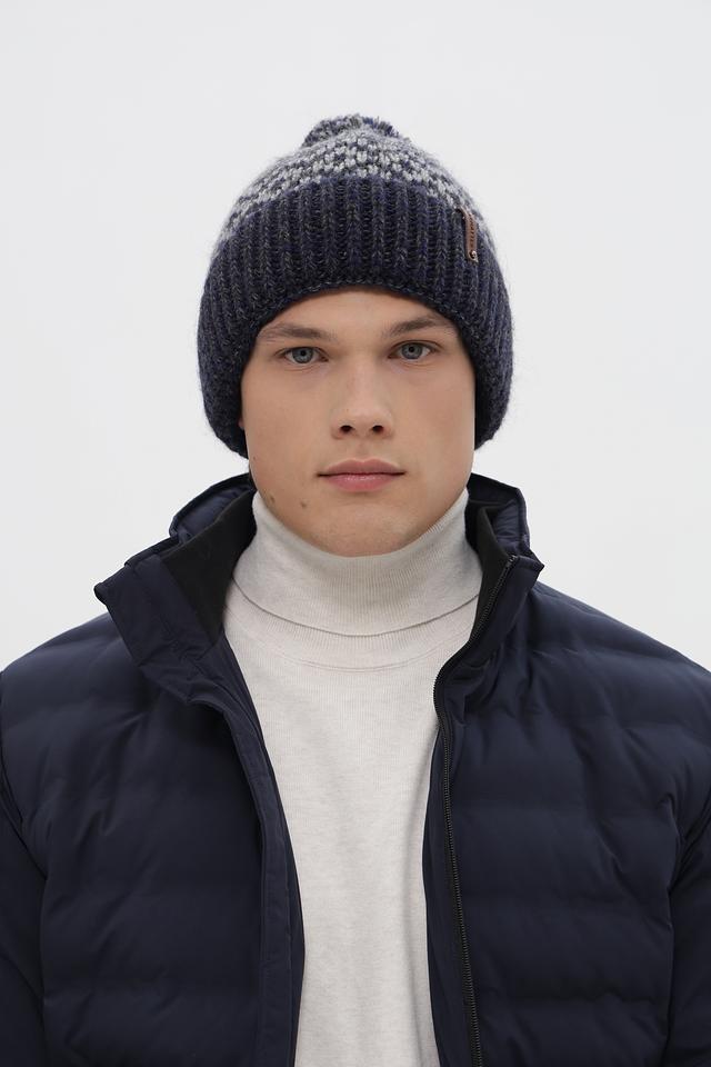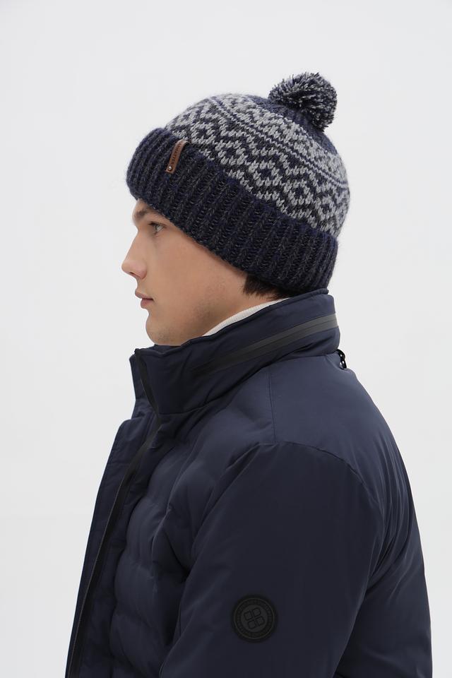 Мужская шапка Marhatter синего цвета с жаккардовым узором и помпоном. Изготовлена из мягкого сочетания полиакрила, полиамида, шерсти и альпаки для комфорта и тепла. Состав: полиакрил 70%, полиамид 20%, шерсть 5%, альпака 5%