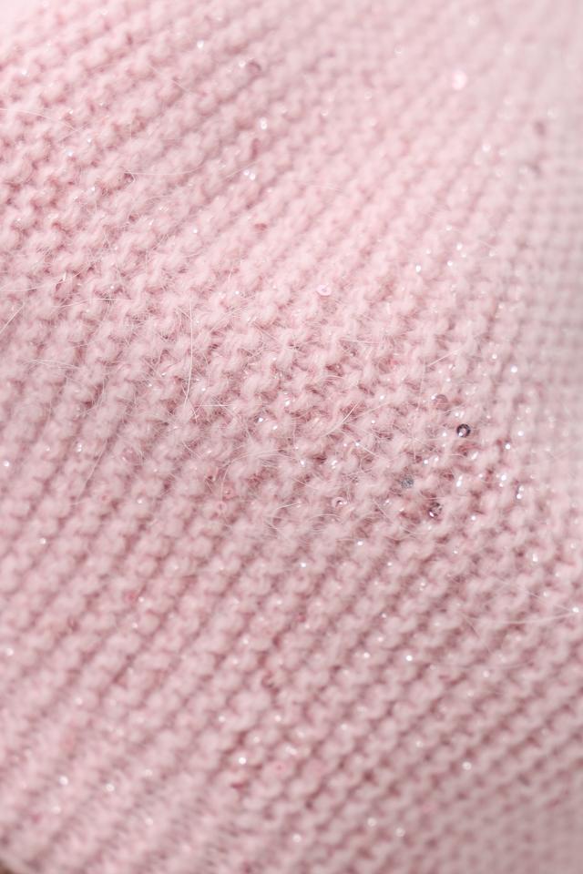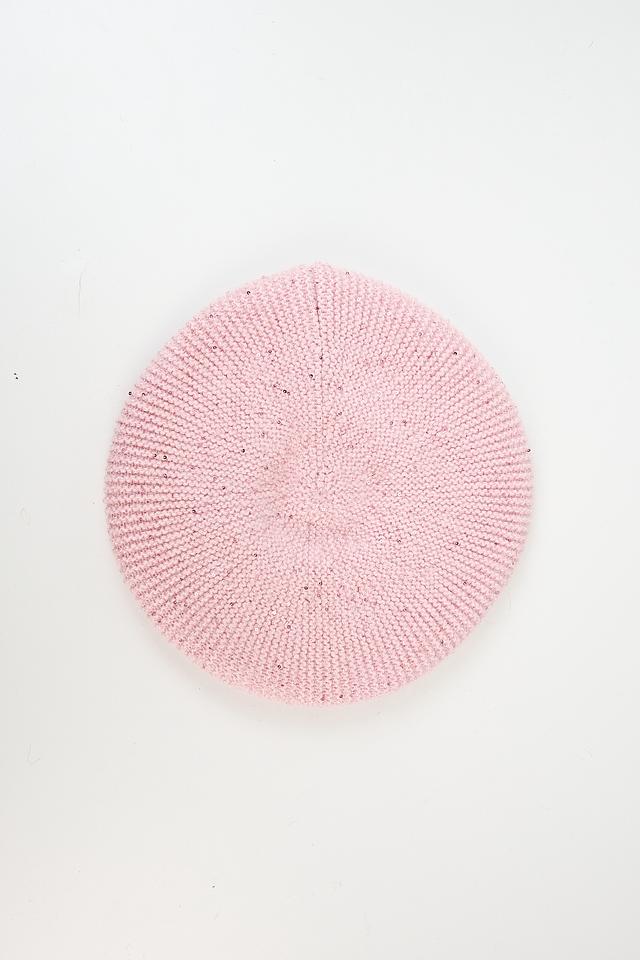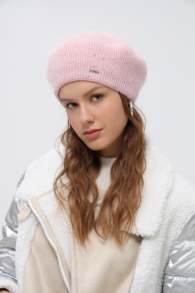 Берет имеет круглую форму и декорирован пайетками, которые добавляют образу изысканности и блеска. Аккуратная вязка подчеркивает стиль и элегантность изделия.