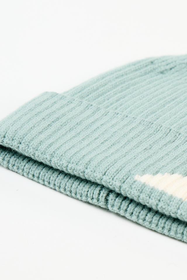 Шапка выполнена из мягкого трикотажа, который обеспечивает тепло и уют. Дизайн дополнен контрастными белыми и бежевыми полосками, создающими эффектный визуальный акцент.