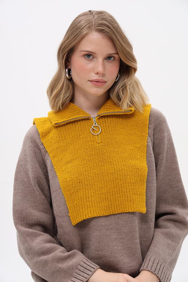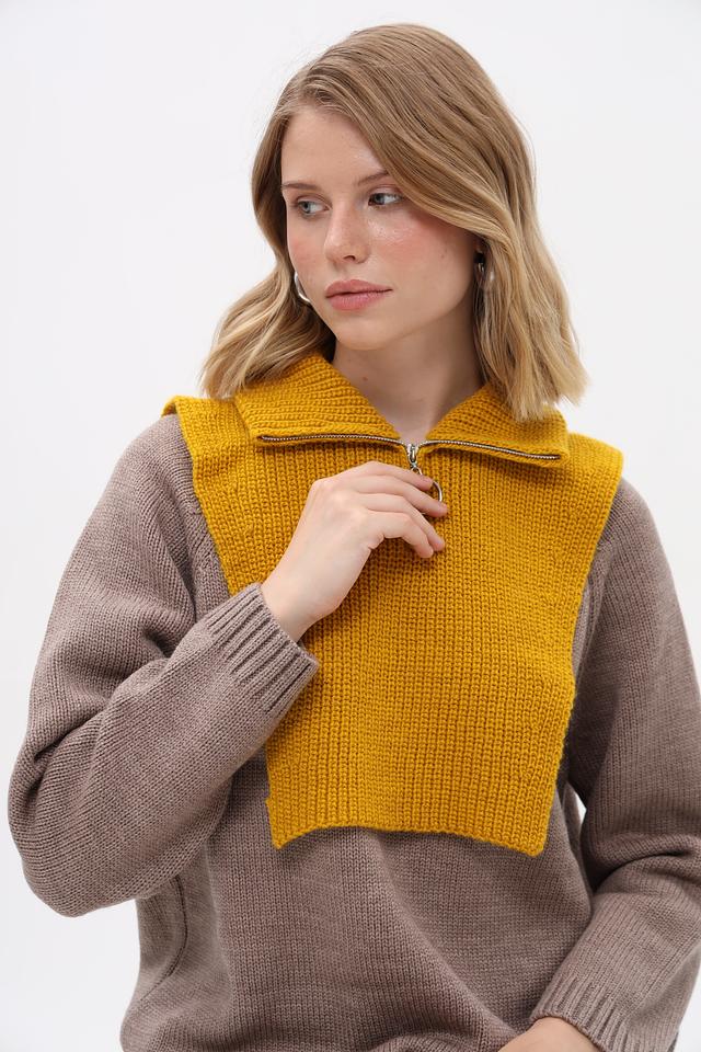 Выполнена в актуальном горчичном цвете, модель имеет вязаную текстуру и удобную застежку-молнию. Благодаря этому, манишку можно носить как самостоятельный элемент, так и сочетать с другой одеждой, создавая многослойные образы.