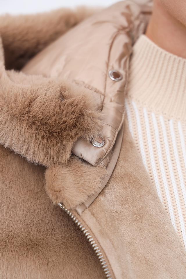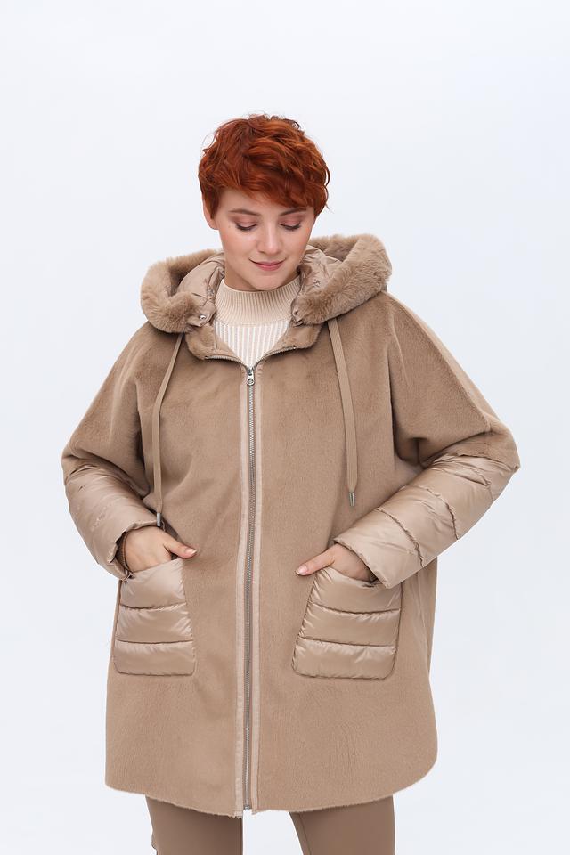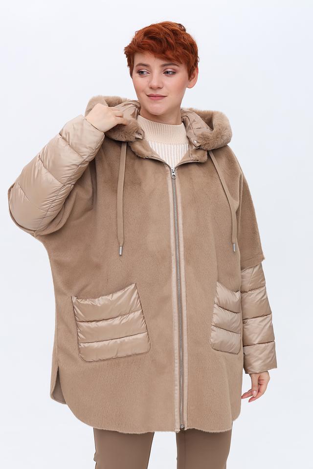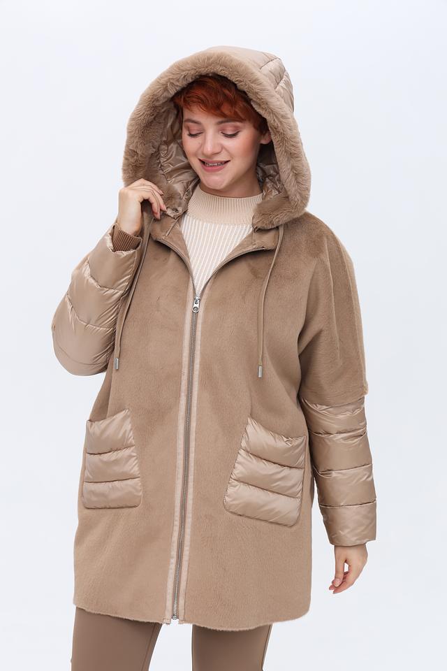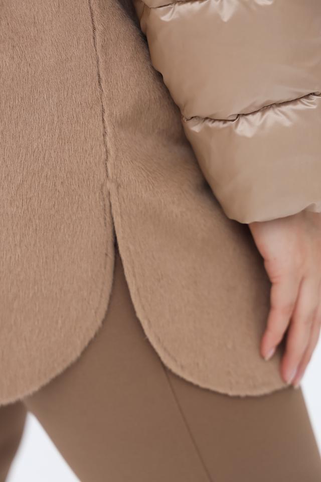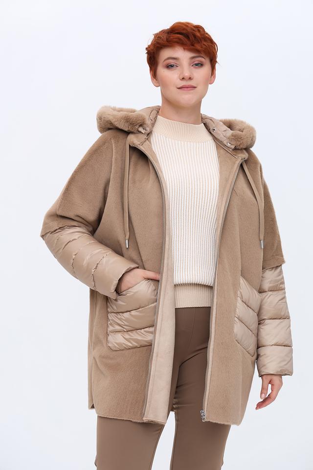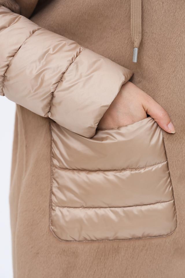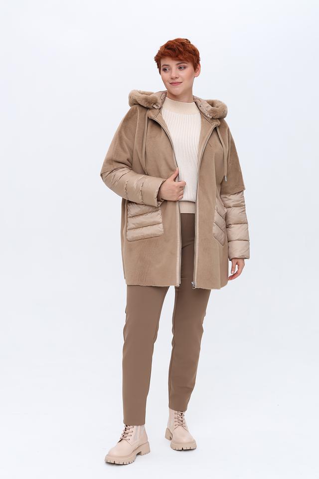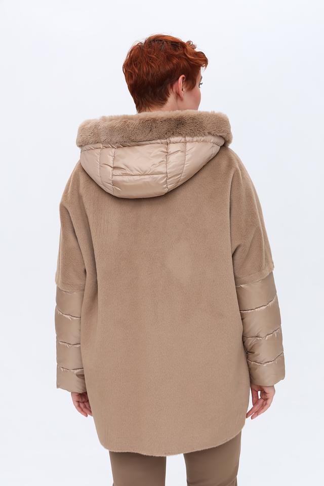 Пальто имеет капюшон, отделанный искусственным мехом, что придает ему особый шарм и защищает от непогоды. Основная часть пальто выполнена из мягкого плюша, а рукава и карманы – из стеганой ткани, создавая интересный контраст фактур.
