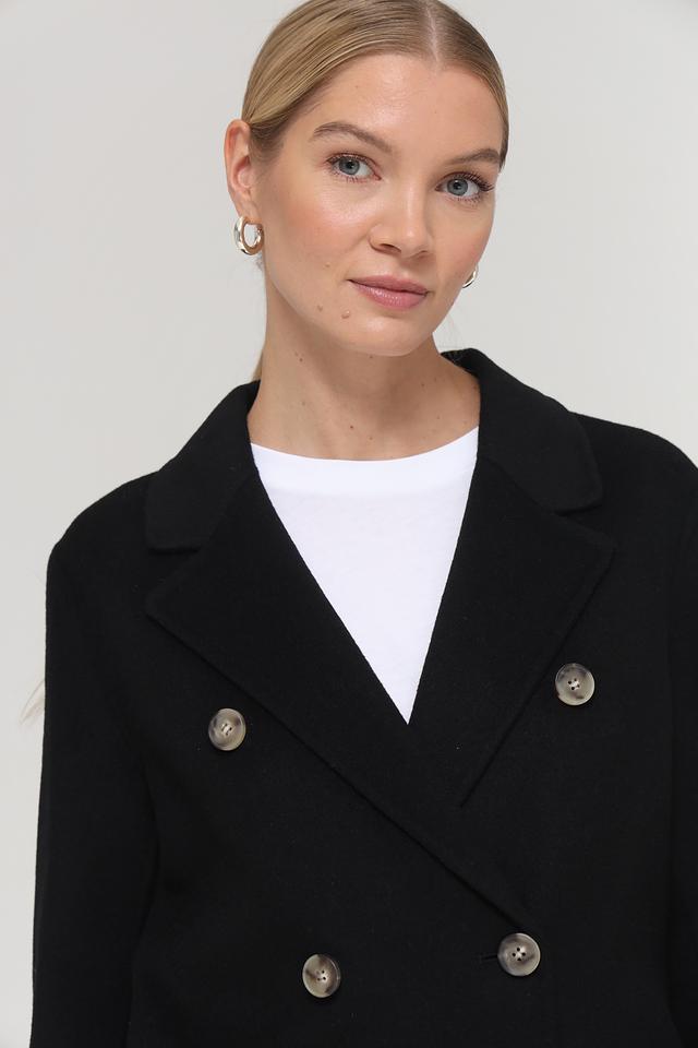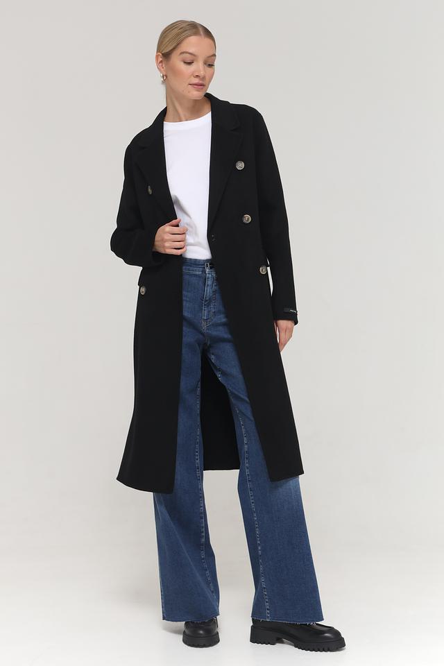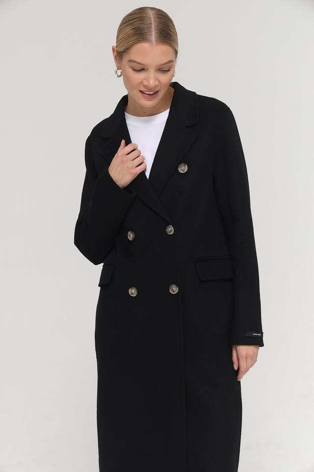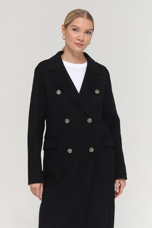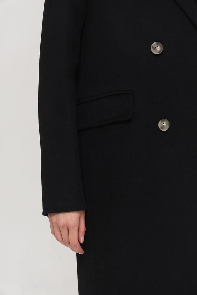 Чёрное пальто Milestone классического кроя выполнено из шерсти с добавлением полиэстера. Модель имеет двубортную застёжку и длинный силуэт, идеально подходящий для создания элегантных образов. Состав: шерсть 52%, полиэстер 40%, вискоза 4%, полиакрил 4%