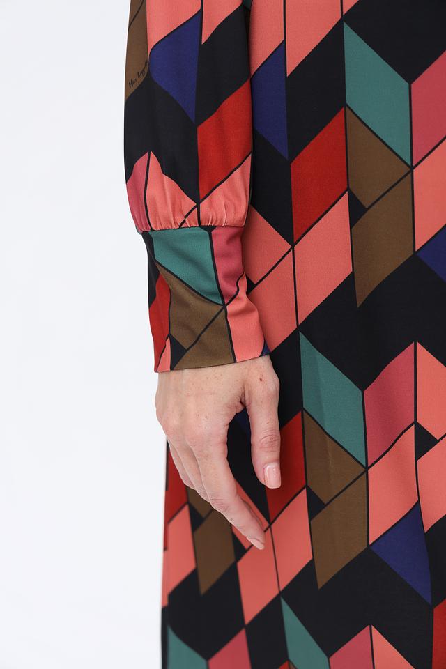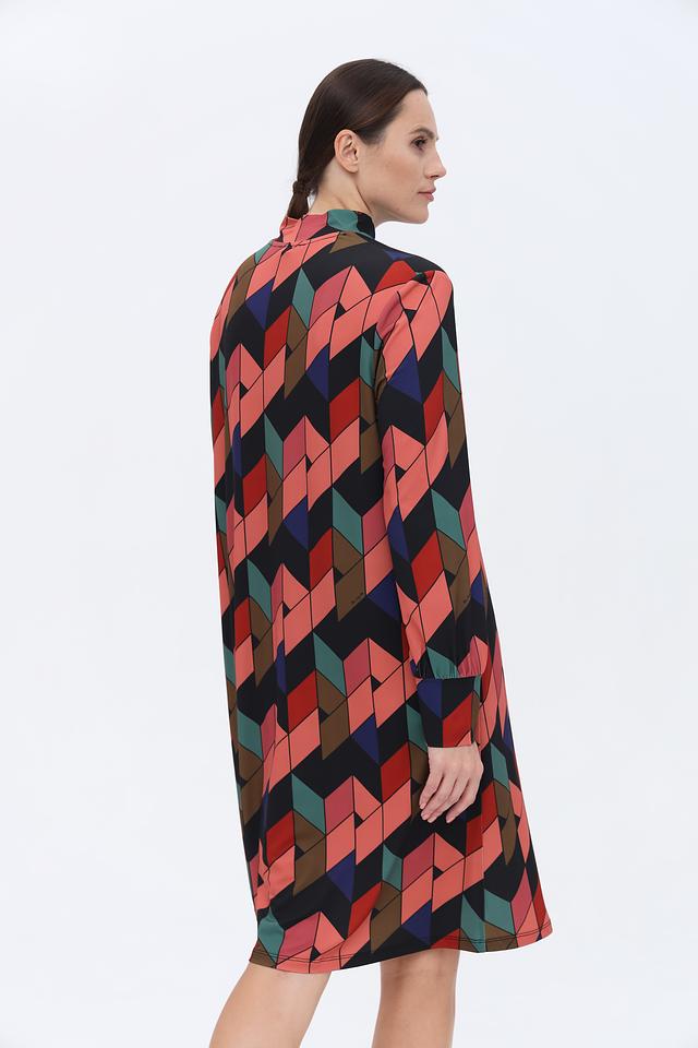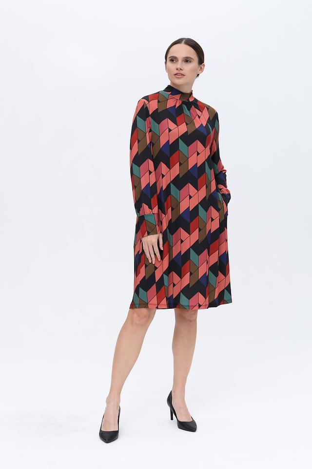 Платье имеет прямой силуэт и длину до колена. Отличительной особенностью является яркий геометрический принт, выполненный в сочетании нескольких цветов: чёрного, красного, коричневого, зелёного и синего. Высокий воротник-стойка и длинные рукава добавляют образу изысканности.