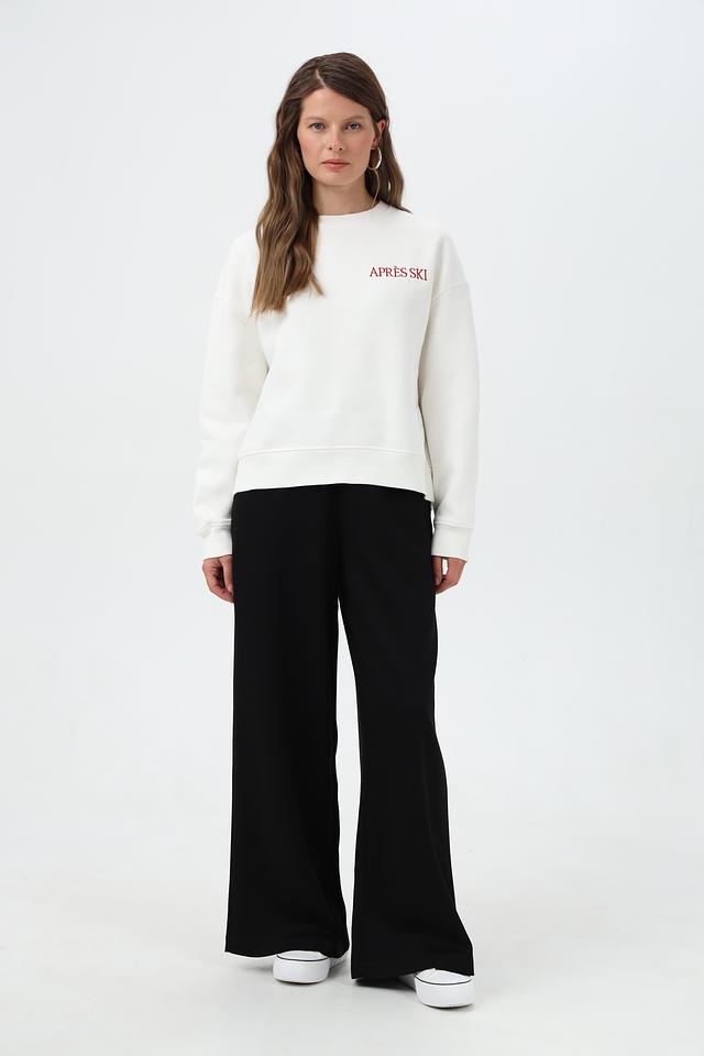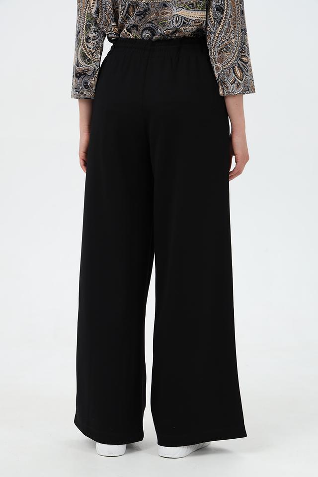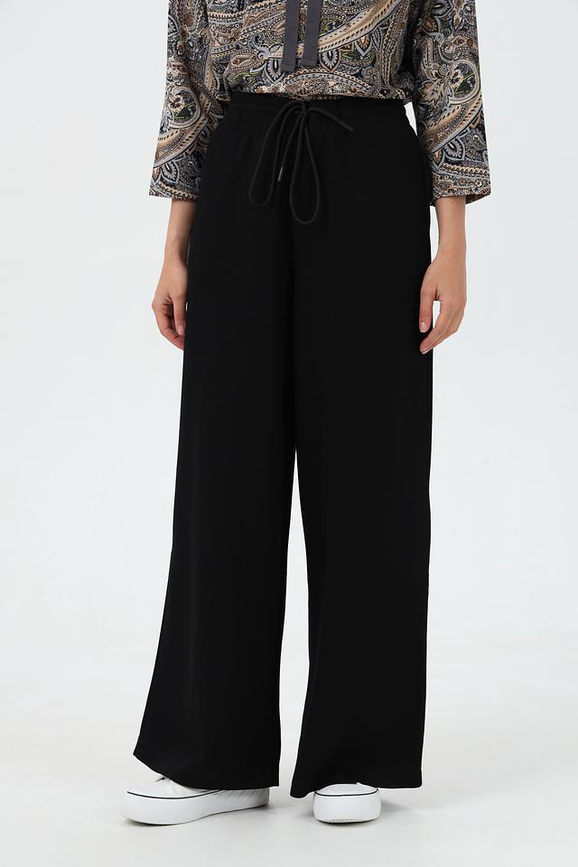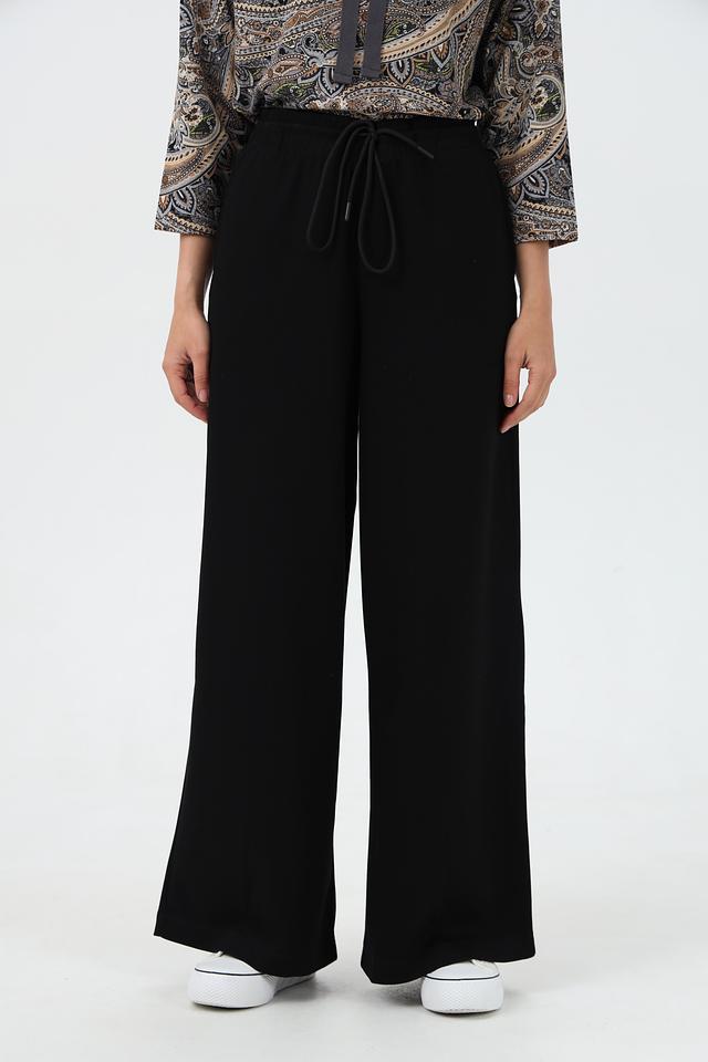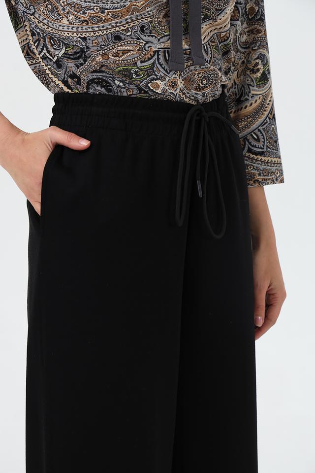 Брюки имеют завышенную талию, которая визуально удлиняет ноги и подчеркивает фигуру. Удобный пояс на кулиске обеспечивает комфортную посадку и позволяет регулировать обхват талии.