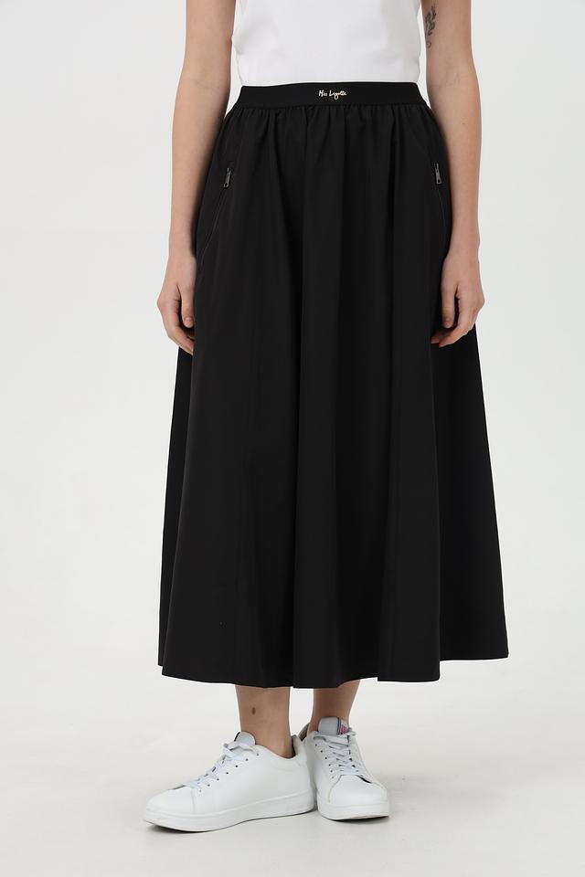 Модель имеет удобный эластичный пояс, обеспечивающий идеальную посадку по фигуре. По бокам расположены функциональные молнии, добавляющие юбке динамичности и практичности, а также боковые карманы.