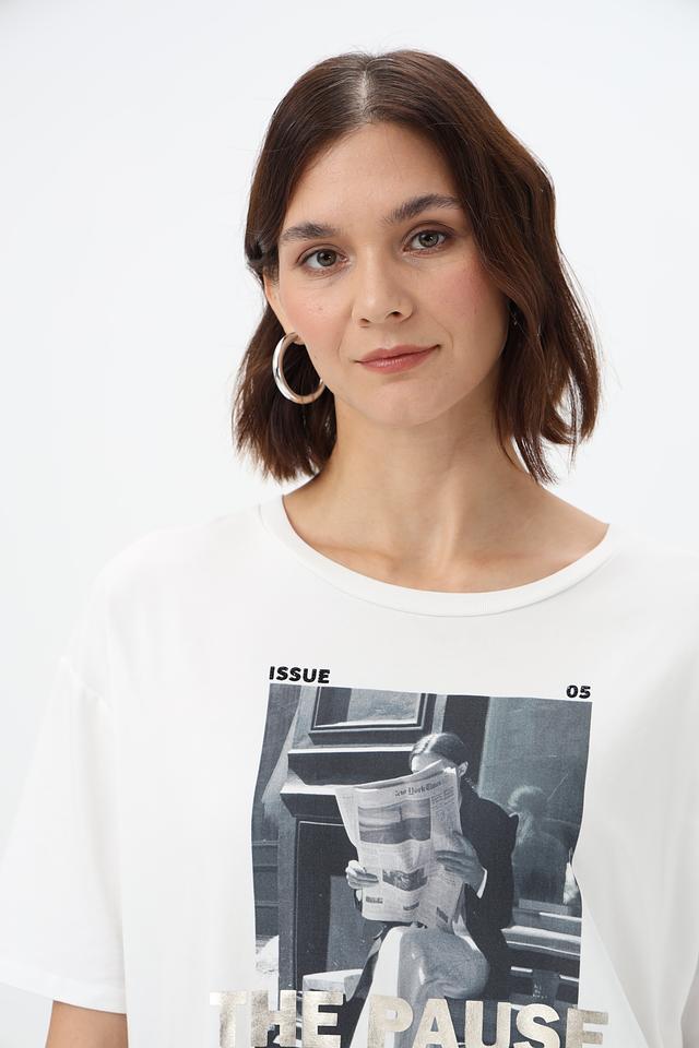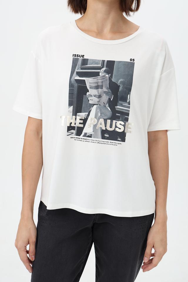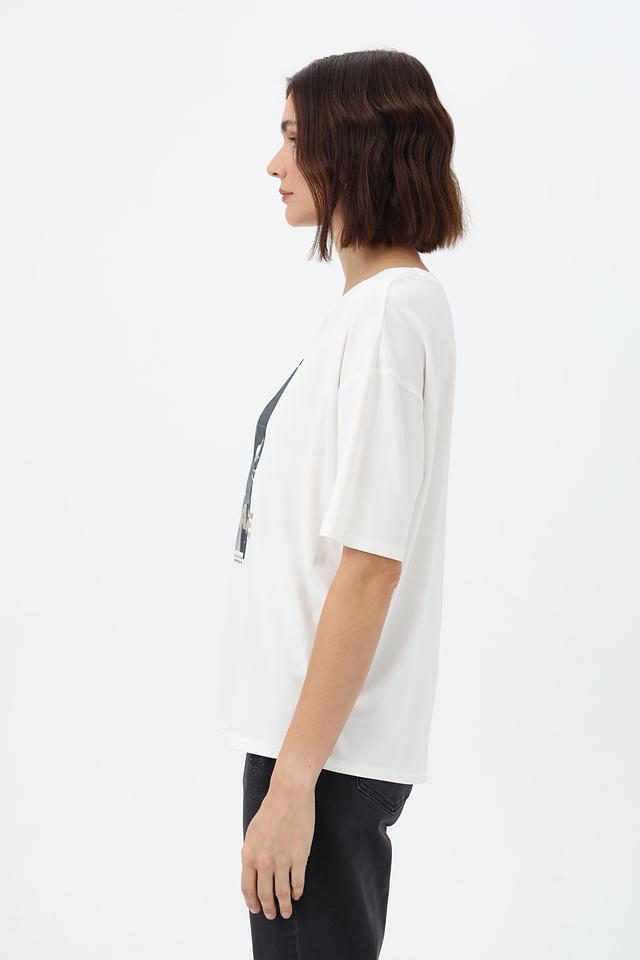 Передняя часть футболки украшена крупным графичным принтом в чёрно-белой гамме, добавляющим образу выразительности.