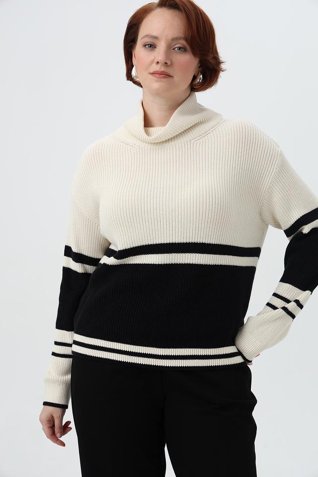 Модель выполнена в бежевом цвете с широкими контрастными полосами чёрного и белого цветов, что придает ей выразительность и динамичность.