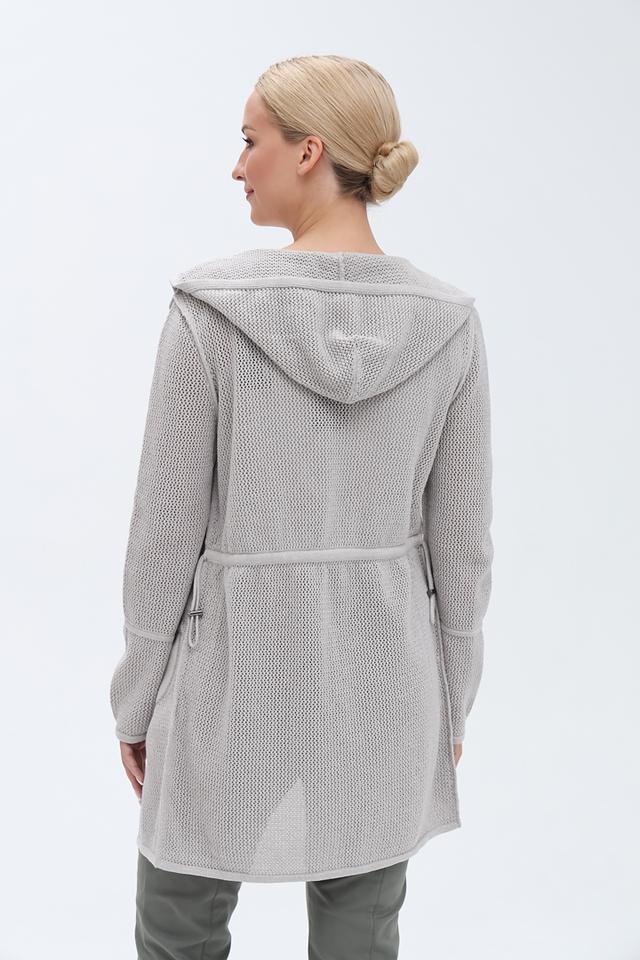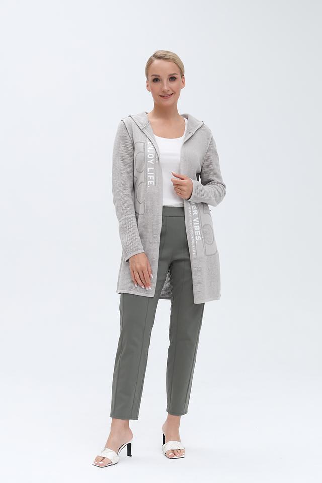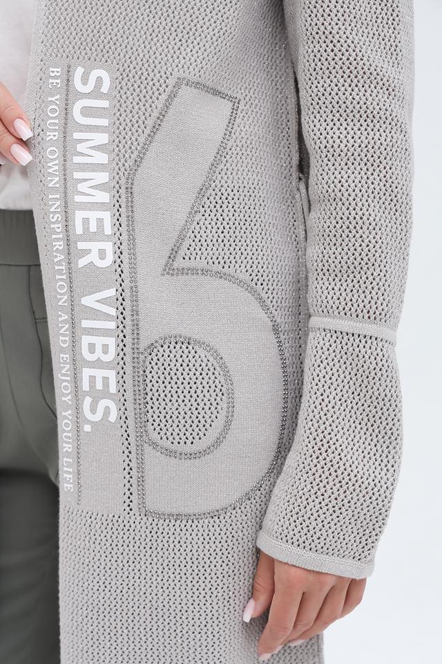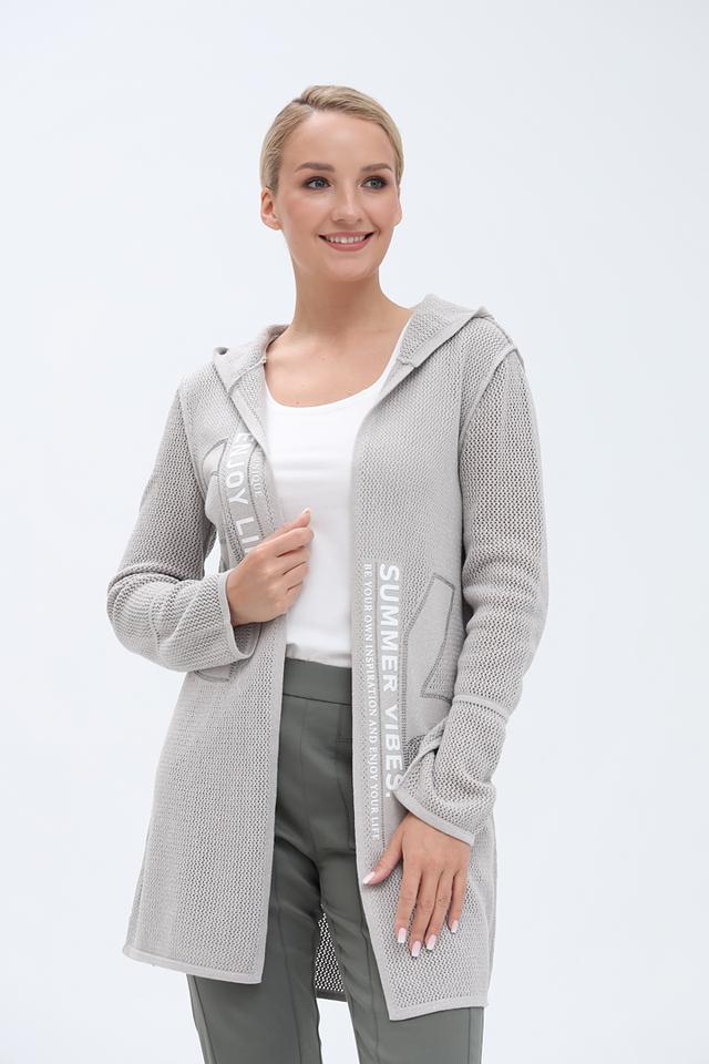 Серый жакет от Monari – это стильный кардиган с капюшоном и оригинальными надписями. Изготовлен из хлопкового трикотажа с добавлением металлизированной нити, что придает ему особый шарм и лёгкий блеск. Состав: хлопок 93%, метализ.нить 7%