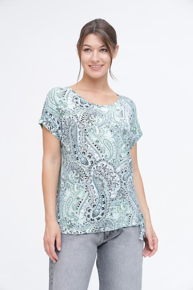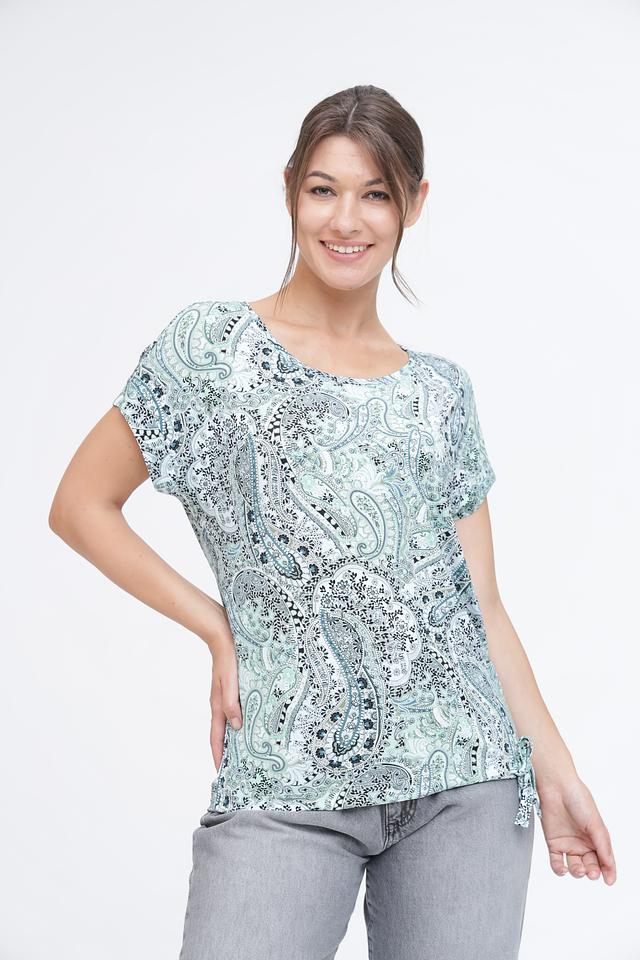 Женская футболка Monari бирюзового цвета с оригинальным принтом пейсли. Изготовлена из мягкой вискозы с добавлением эластана для комфорта и свободы движений. Стильный и удобный вариант для повседневного образа. Состав: вискоза 94%, эластан 6%